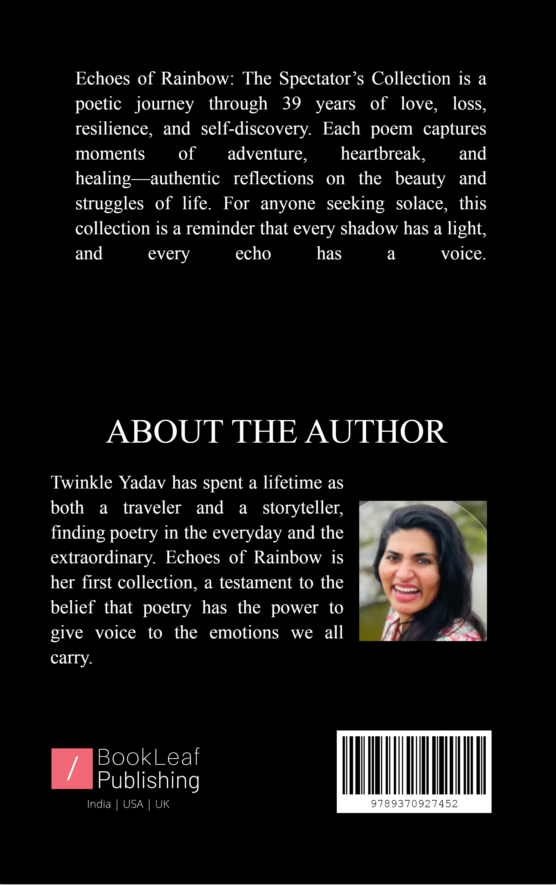 Echoes of Rainbow: The Spectator’s Collection is a poetic journey through 39 years of love, loss, resilience, and self-discovery. Each poem captures moments of adventure, heartbreak, and healing—authentic reflections on the beauty and struggles of life. For anyone seeking solace, this collection is a reminder that every shadow has a light, and every echo has a voice.
