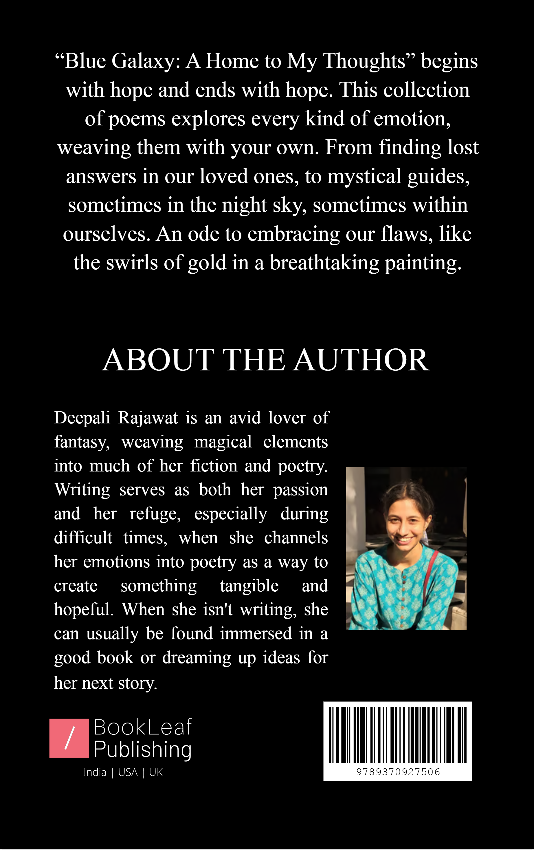 “Blue Galaxy: A Home to My Thoughts” begins with hope and ends with hope. This collection of poems explores every kind of emotion, weaving them with your own. From finding lost answers in our loved ones, to mystical guides, sometimes in the night sky, sometimes within ourselves. An ode to embracing our flaws, like the swirls of gold in a breathtaking painting.