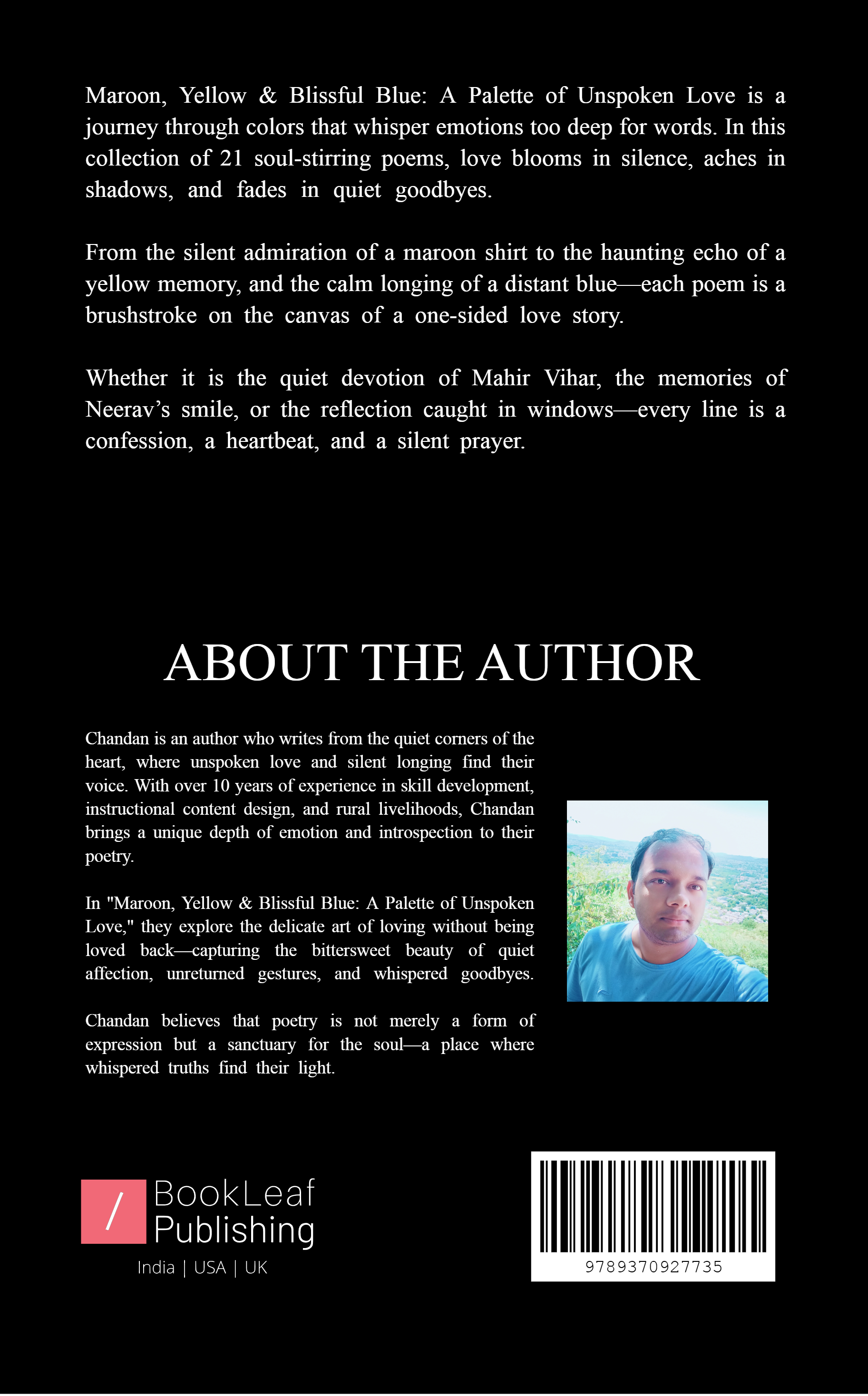 Maroon, Yellow & Blissful Blue: A Palette of Unspoken Love is a journey through colors that whisper emotions too deep for words. In this collection of 21 soul-stirring poems, love blooms in silence, aches in shadows, and fades in quiet goodbyes.