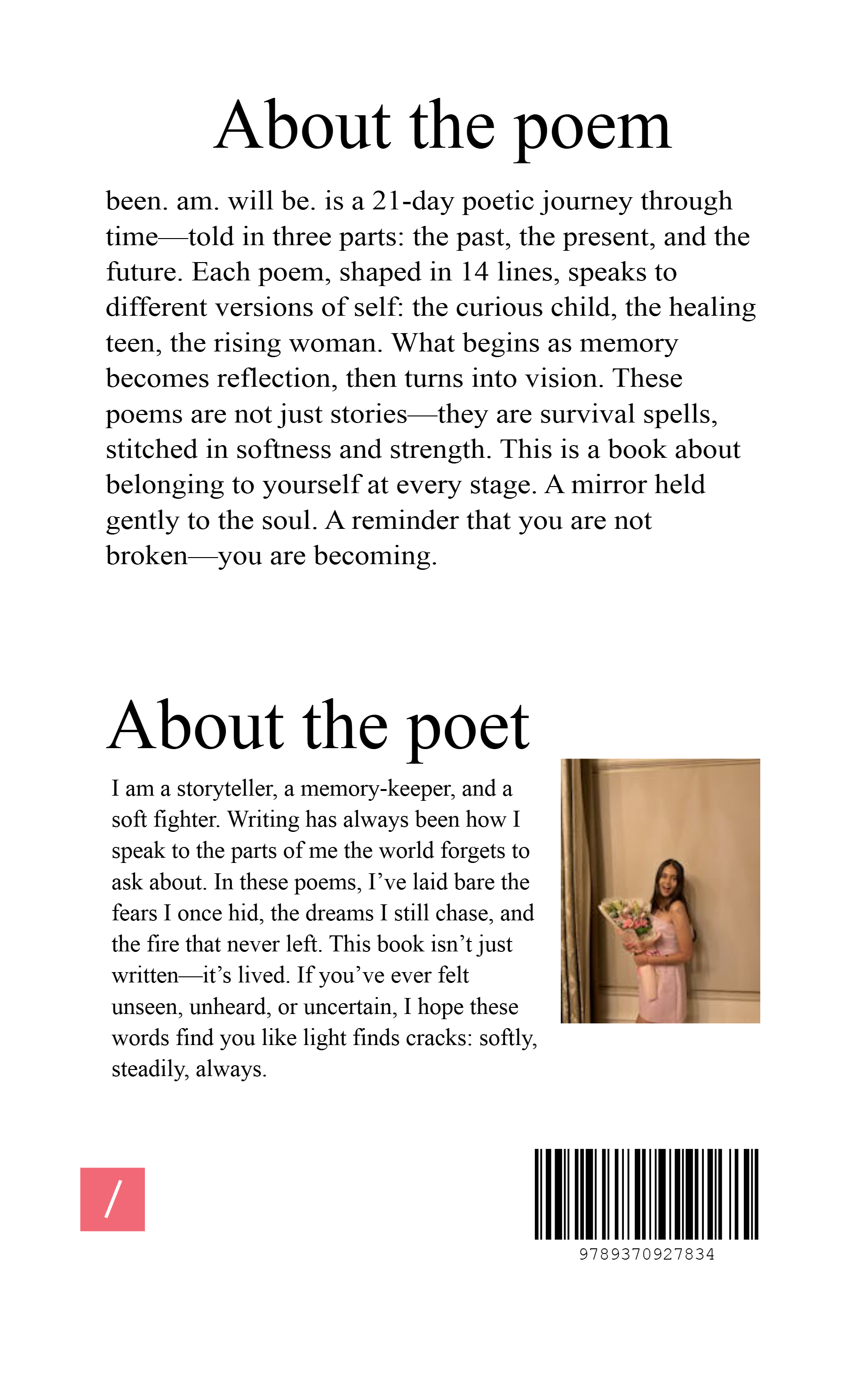 been. am. will be. is a poetry collection exploring identity, healing, and becoming. Told in three parts—past, present, and future—each is a letter to self: the child who danced freely, the teen who learned to survive, and the woman stepping into her power. Raw yet tender, these poems hold memory, fear, hope, and transformation in equal measure. This is a book for anyone who’s ever questioned their worth, carried quiet pain, or dared to imagine more. A poetic journey of self-love and return.
