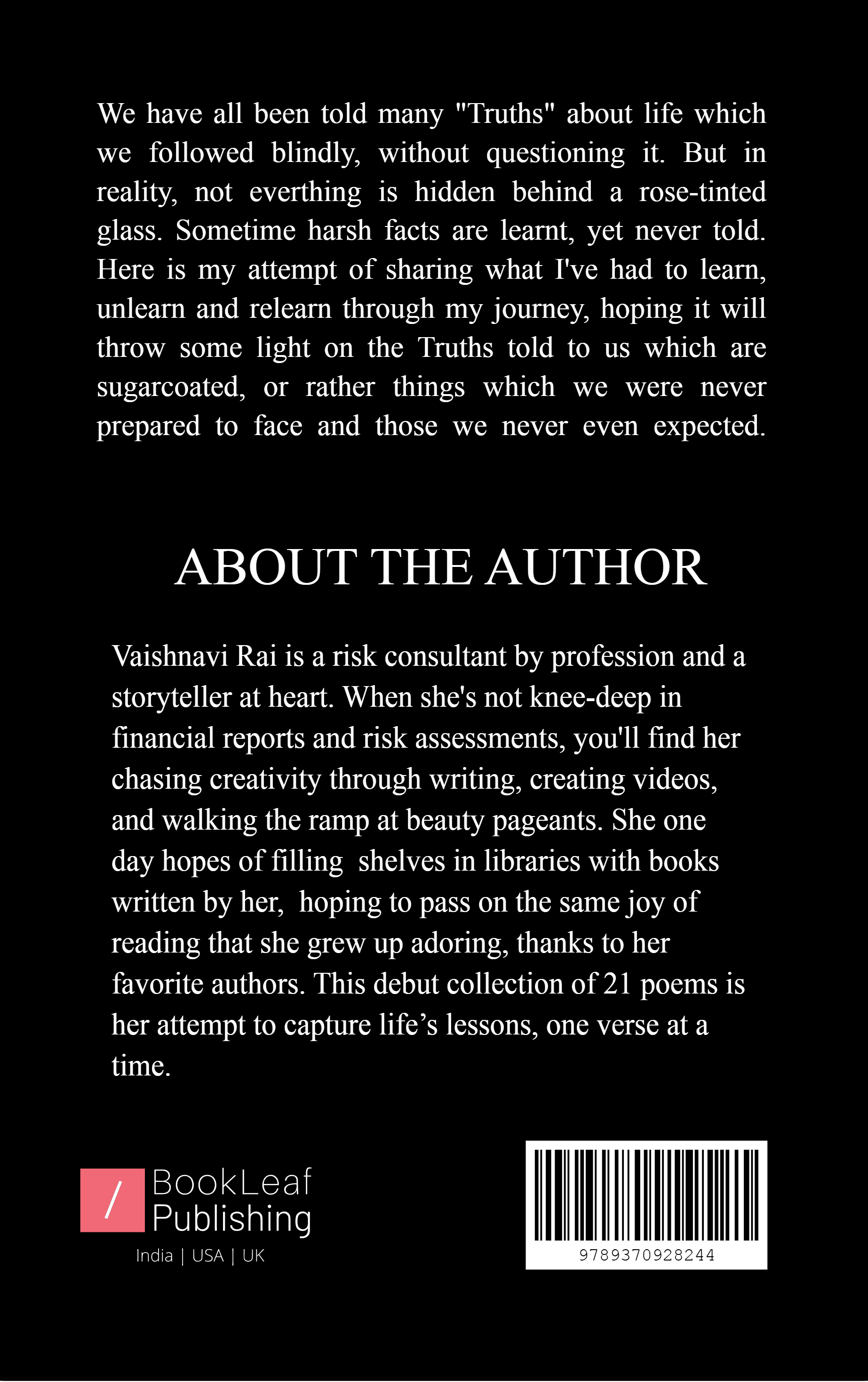 We have all been told many "truth's" about life which we followed blindly, without questioning it. But in reality, not everthing is hidden behind a rose-tinted glass. Sometime harsh facts are learnt, yet never told. Here is my attempt of sharing what I've had to learn, unlearn and relearn through my journey, hoping it will throw some light on the Truths told to us which are sugarcoated, or rather things which we were never prepared to face and those we never even expected.