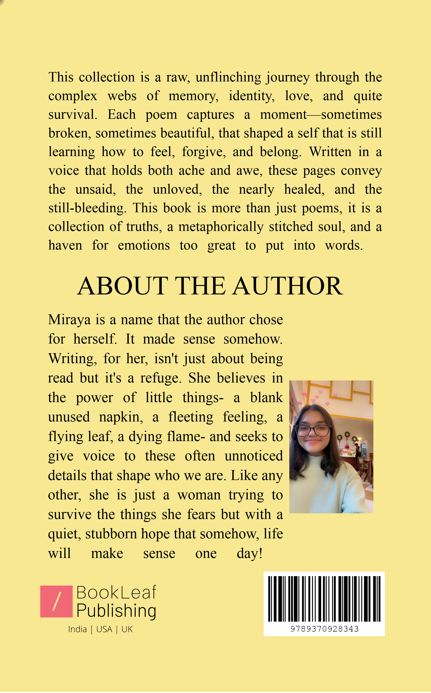 This collection is a raw, unflinching journey through the complex webs of memory, identity, love, and quite survival. Each poem captures a moment—sometimes broken, sometimes beautiful, that shaped a self that is still learning how to feel, forgive, and belong. Written in a voice that holds both ache and awe, these pages convey the unsaid, the unloved, the nearly healed, and the still-bleeding. This book is more than just poems, it is a collection of truths, a metaphorically stitched soul, and a haven for emotions too great to put into words.