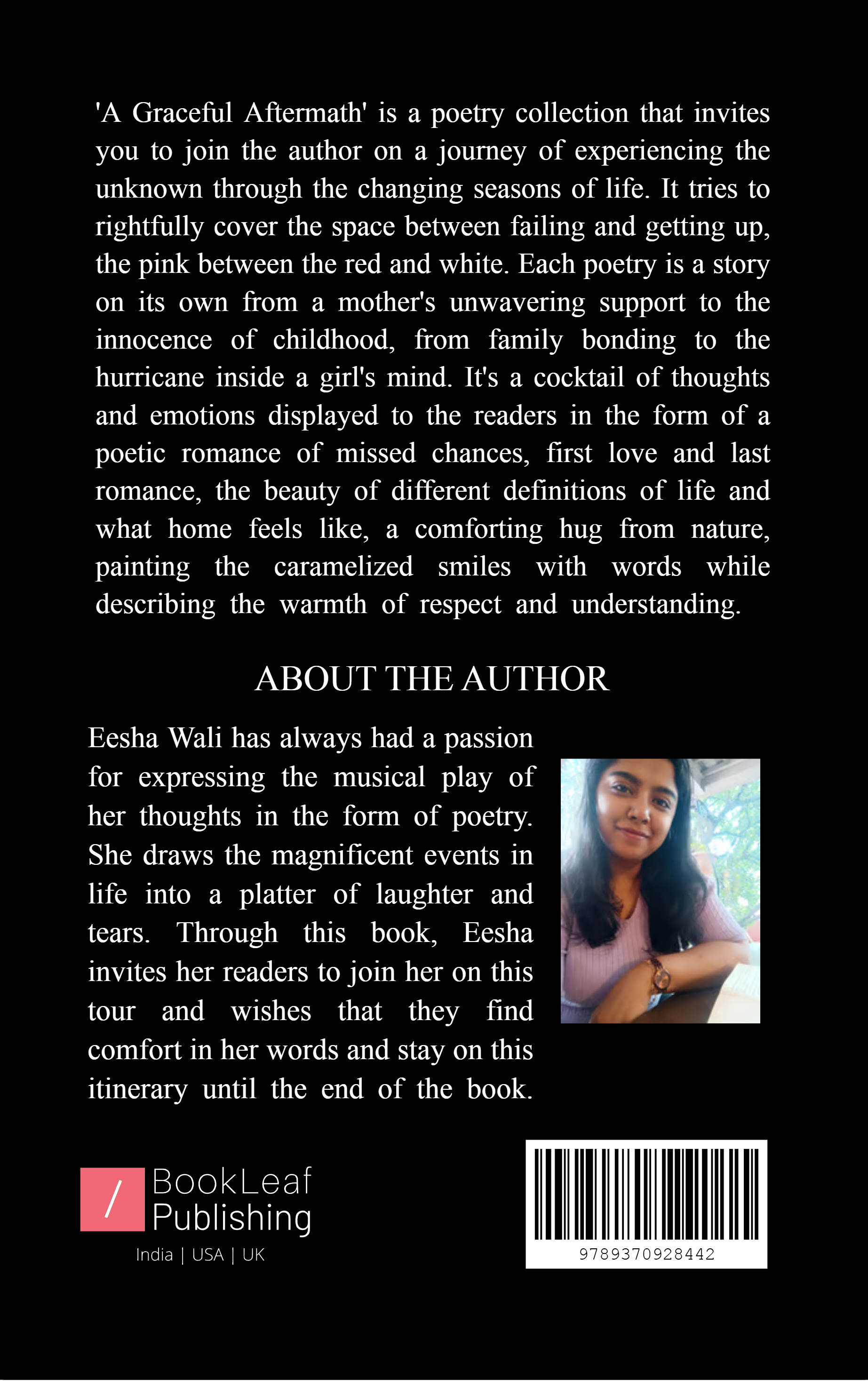 'A Graceful Aftermath' is a poetry collection that invites you to join the author on a journey of experiencing the unknown through the changing seasons of life. Each poetry is a story on its own from a mother's unwavering support to the innocence of childhood, from family bonding to the hurricane inside a girl's mind. It's a cocktail of thoughts and emotions displayed to the readers in the form of a poetic romance of missed chances, first love and last romance, the beauty of different definitions of life and what home feels like.