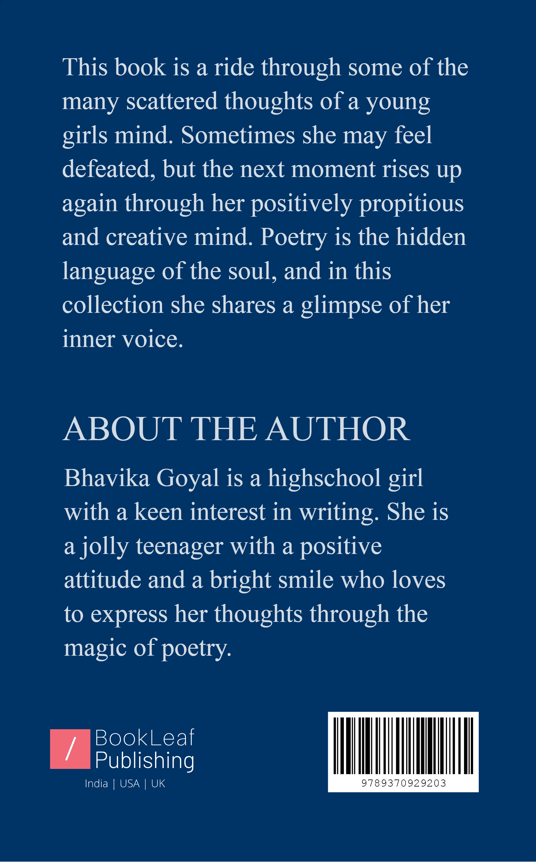 This book is a ride through some of the many scattered thoughts of a young girls mind. Sometimes she may feel defeated, but the next moment rises up again through her positively propitious and creative mind. Poetry is the hidden language of her soul, and in this collection she shares a glimpse of her inner voice.