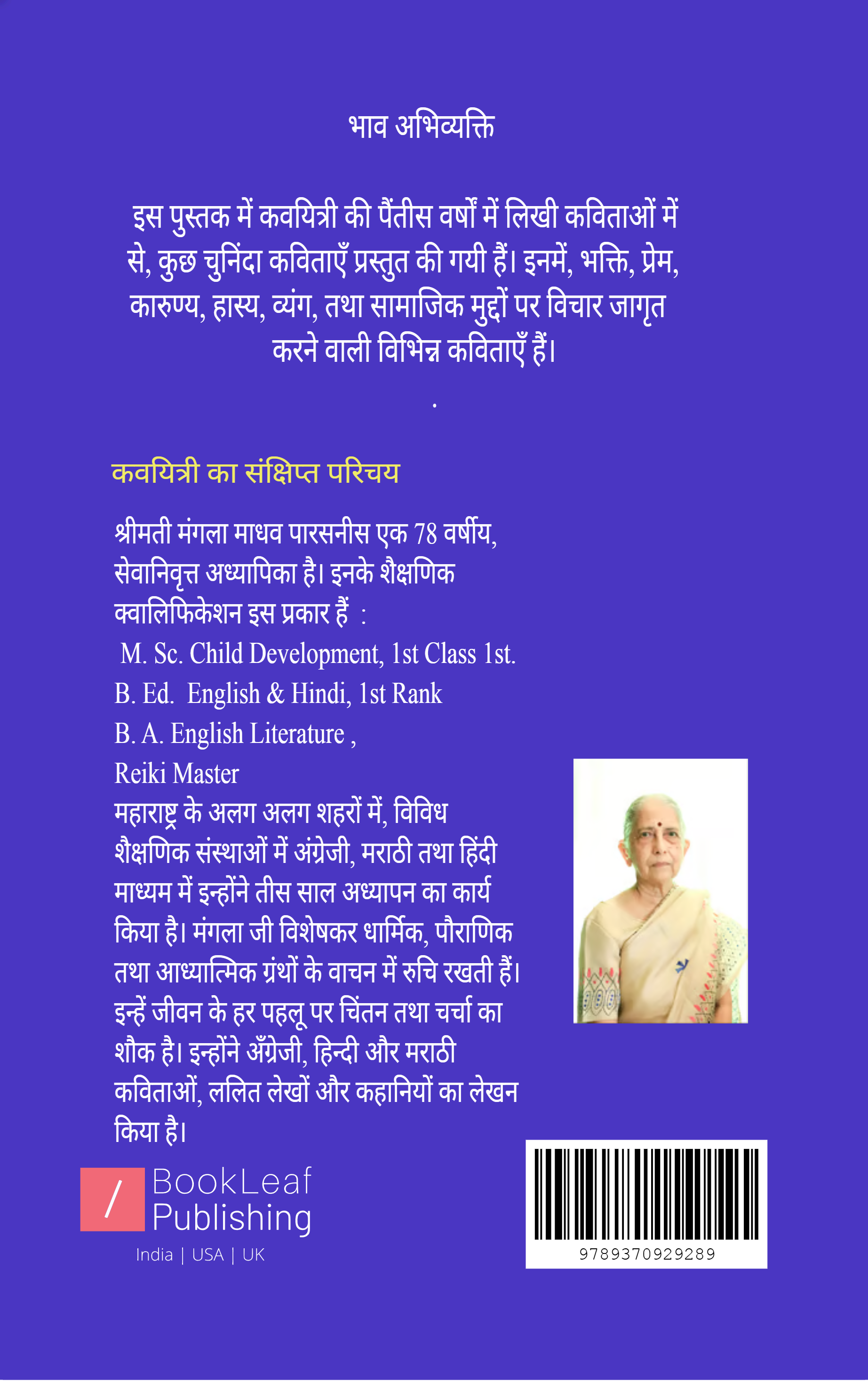 इस पुस्तक में कवयित्री की पैंतीस वर्षों में लिखी कविताओं में से कुछ चुनिंदा कविताएँ प्रस्तुत की गयी हैं। इनमें भक्ति, प्रेम, कारुण्य, हास्य, व्यंग, तथा सामाजिक मुद्दों पर विचार जागृत करने वाली विभिन्न कविताएँ हैं।
