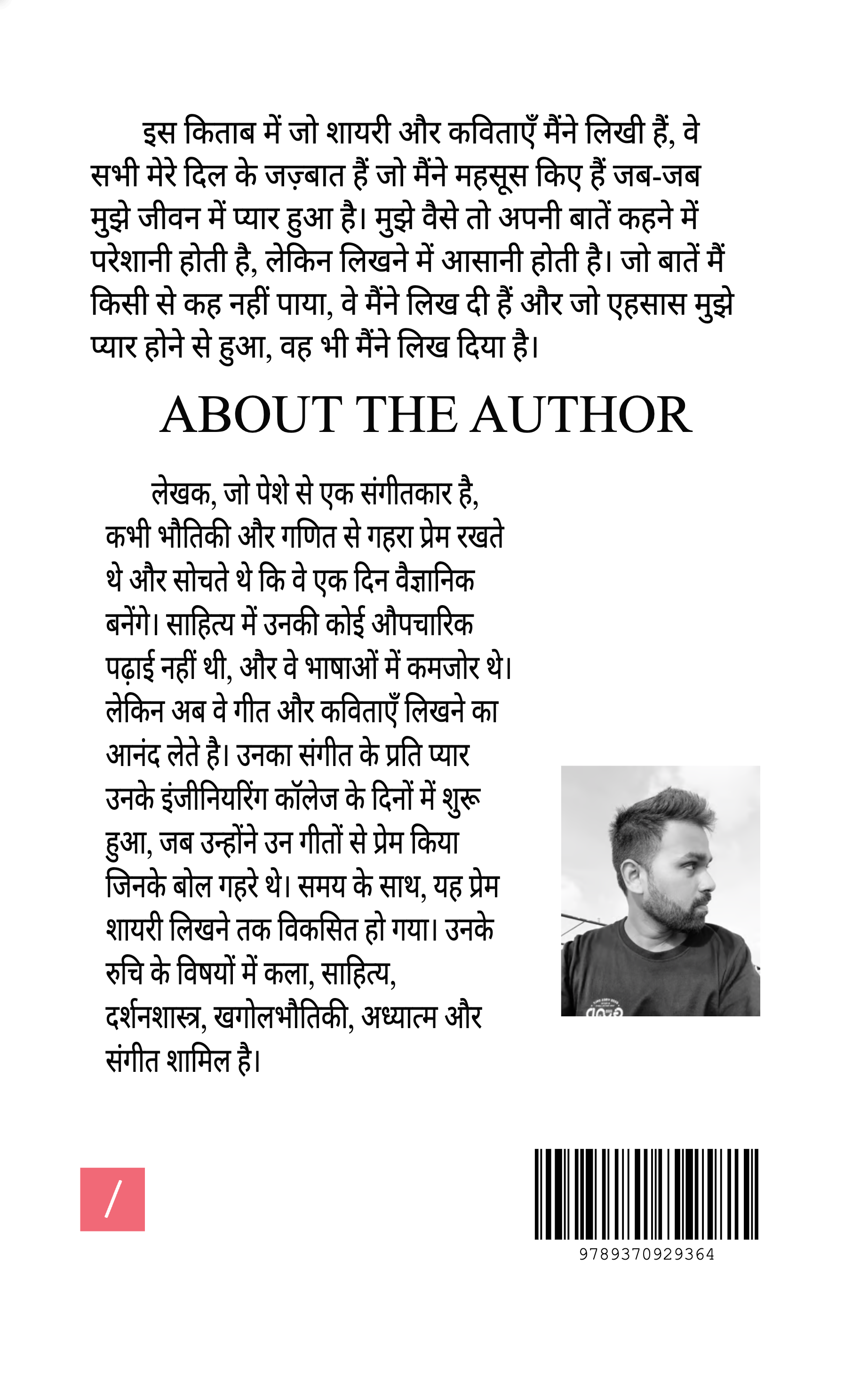 इस किताब में जो शायरी और कविताएँ मैंने लिखी हैं, वे सभी मेरे दिल के जज़्बात हैं जो मैंने महसूस किए हैं जब-जब मुझे जीवन में प्यार हुआ है। मुझे वैसे तो अपनी बातें कहने में परेशानी होती है, लेकिन लिखने में आसानी होती है। जो बातें मैं किसी से कह नहीं पाया, वे मैंने लिख दी हैं और जो एहसास मुझे प्यार होने से हुआ, वह भी मैंने लिख दिया है।