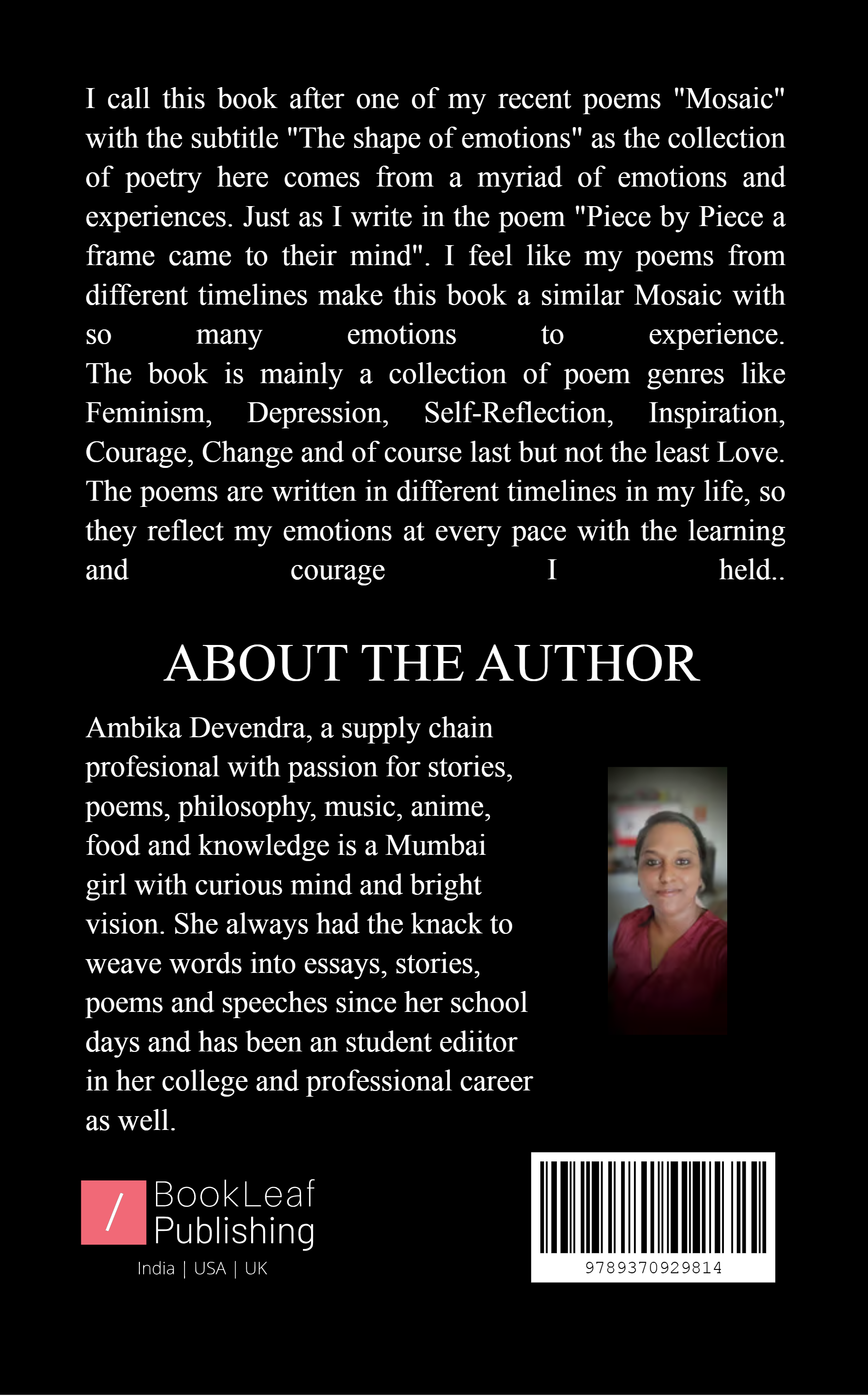 I call this book after one of my recent poems "Mosaic" with the subtitle "The shape of emotions" as the collection of poetry here comes from a myriad of emotions and experiences. Just as I write in the poem "Piece by Piece a frame came to their mind". I feel like my poems from different timelines make this book a similar Mosaic with so many emotions to experience.
