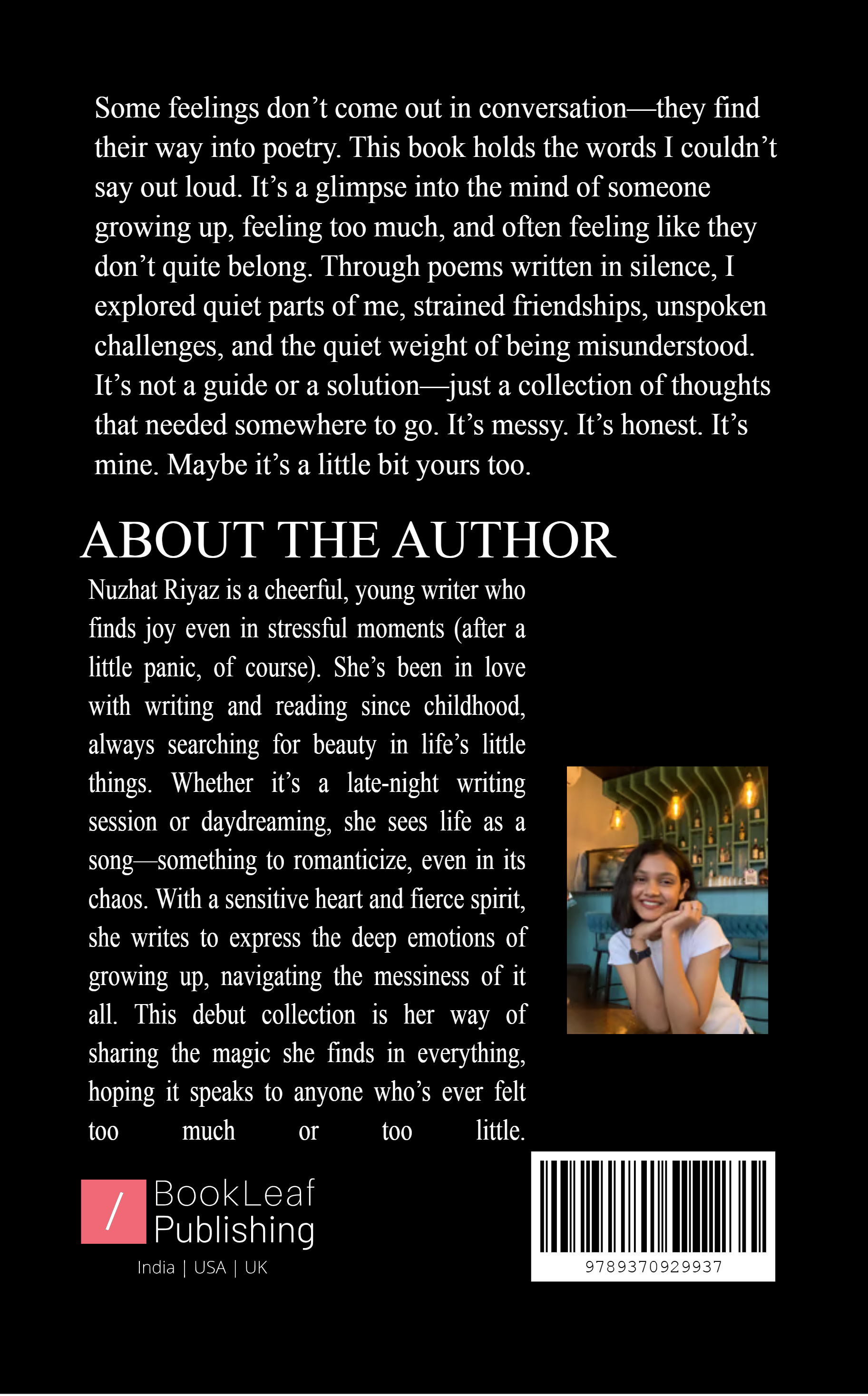 "What the Heart Couldn’t Say" is a poetry collection that gently unveils the quiet moments of growing up—those unspoken thoughts and feelings that often linger in the background. Nuzhat Riyaz’s poetry reflects on the nuances of youth, capturing the complexities of navigating identity, relationships, and the spaces in between. With understated elegance, her words offer a delicate glimpse into the inner world of adolescence, where silence often speaks louder than words.