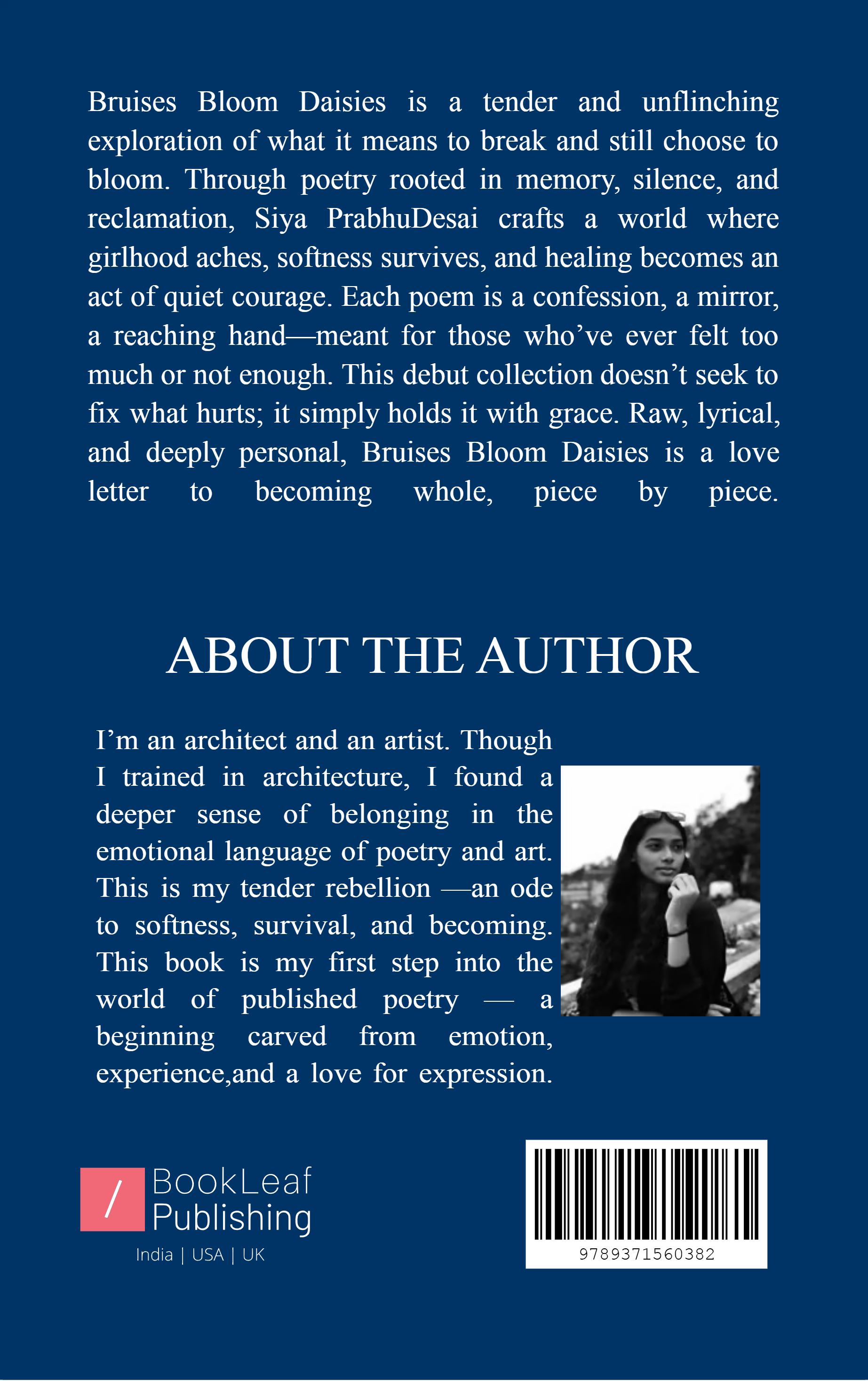 Bruises Bloom Daisies is a quiet rebellion against forgetting—testament to how we carry our wounds and still find ways to flower. These poems trace the nonlinear terrain of healing, where strength lives within pain and vulnerability becomes a fierce kind of courage. In this space, a girl becomes a woman beneath the weight of borrowed expectations, silence becomes both prison and refuge, and the body remembers what the mind resists. This collection doesn’t offer answers—it lingers in the in-between, where meaning waits. It honors the softness that survives, the beauty that rises from ruin, and the bloom born of bruises.