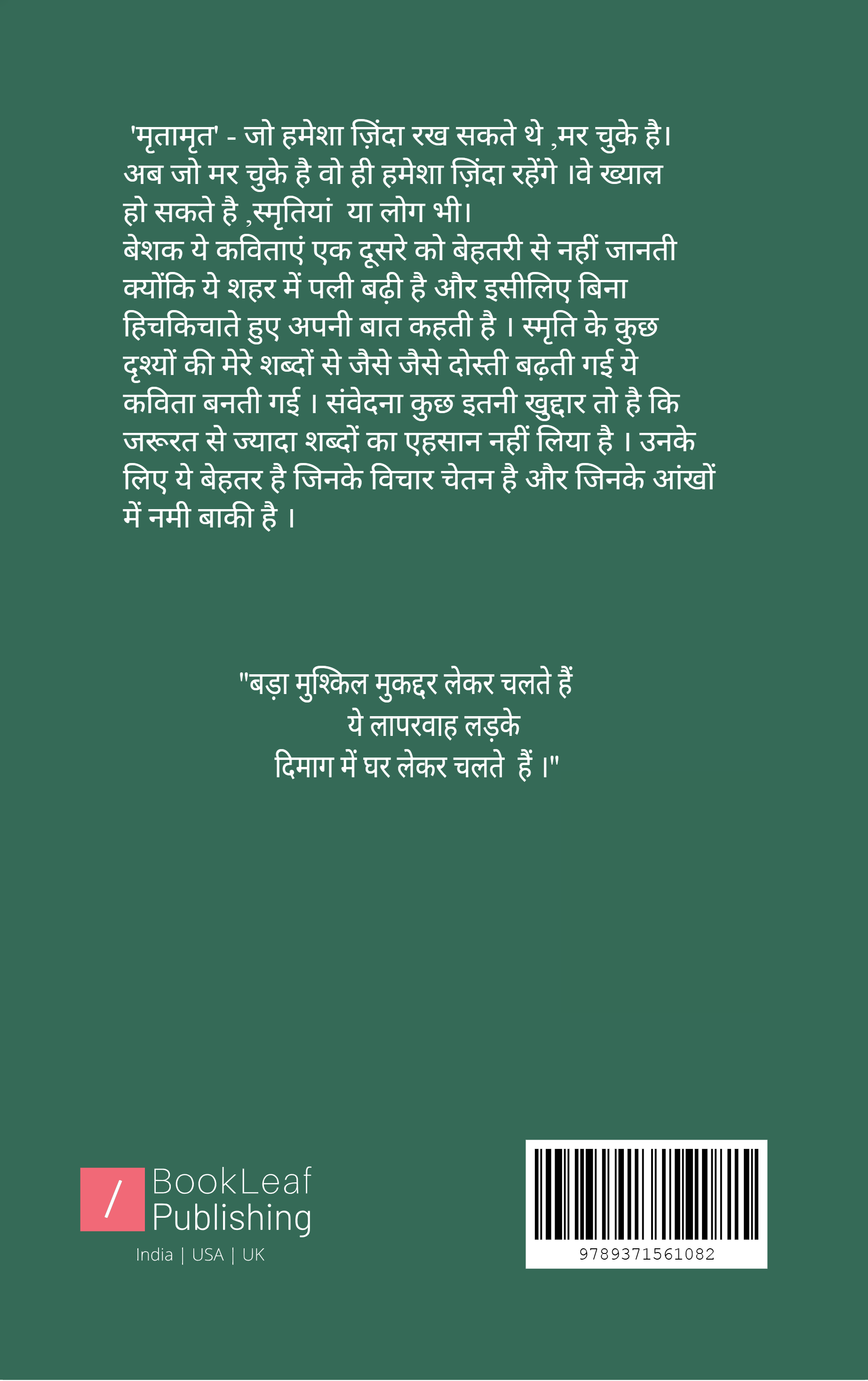 “MRITAMRIT” is a captivating collection of heartfelt poems that delve into the intricate dualities of life—death and immortality, sorrow and joy, silence and expression. Each poem in this book invites readers on a reflective journey through the emotional landscapes of the human soul. With a lyrical blend of depth and simplicity, the poems explore themes of struggle , loss, and hope. ‘Mritamrit’ is more than just a poetry collection—it’s an intimate dialogue between the poet and the reader, offering solace, stirring emotions, and igniting thought. These poems are meant to preserve the moisture of the eyes in the dust-laden air.