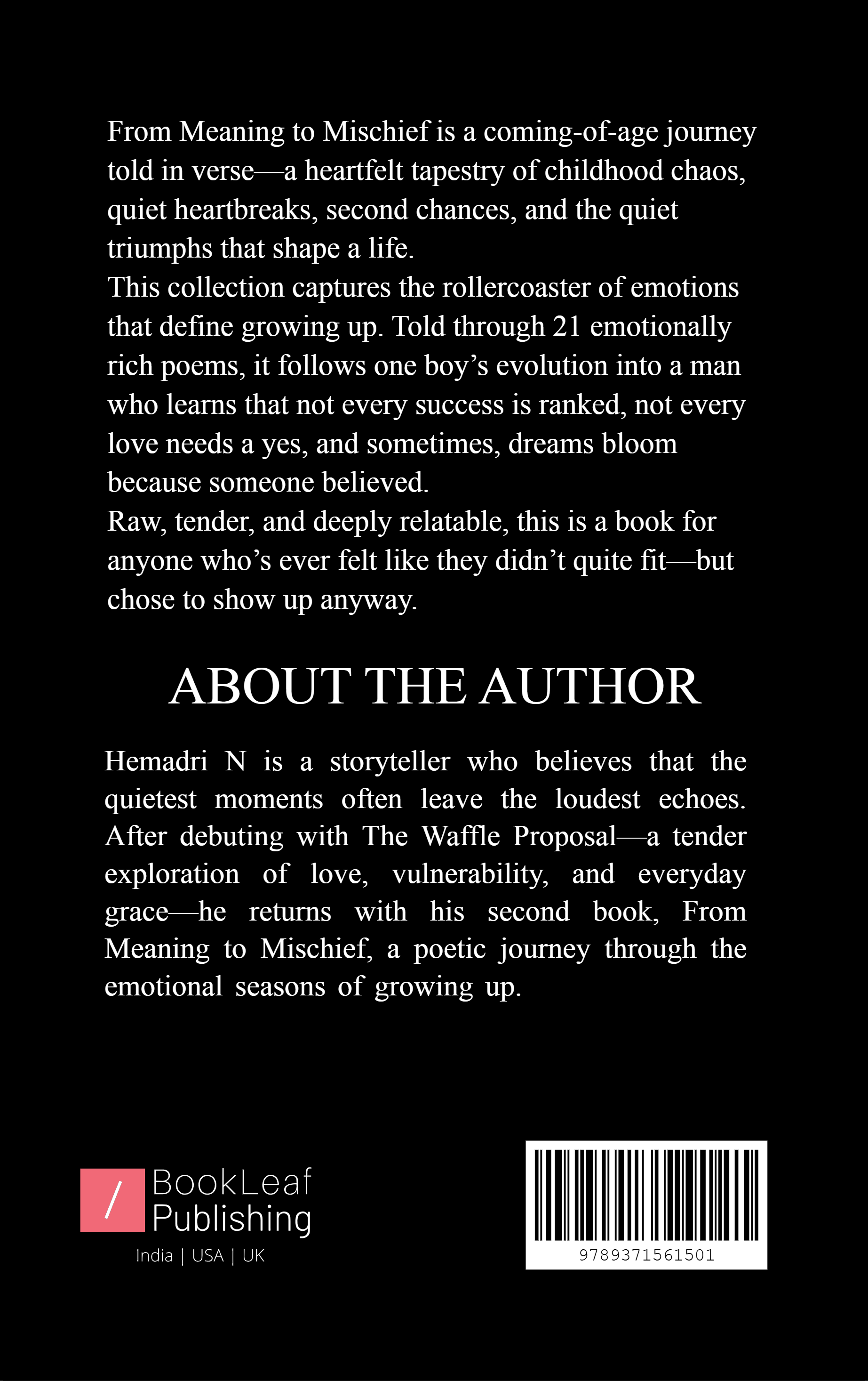 From Meaning to Mischief is a coming-of-age journey told in verse—a heartfelt tapestry of childhood chaos, quiet heartbreaks, second chances, and the quiet triumphs that shape a life.