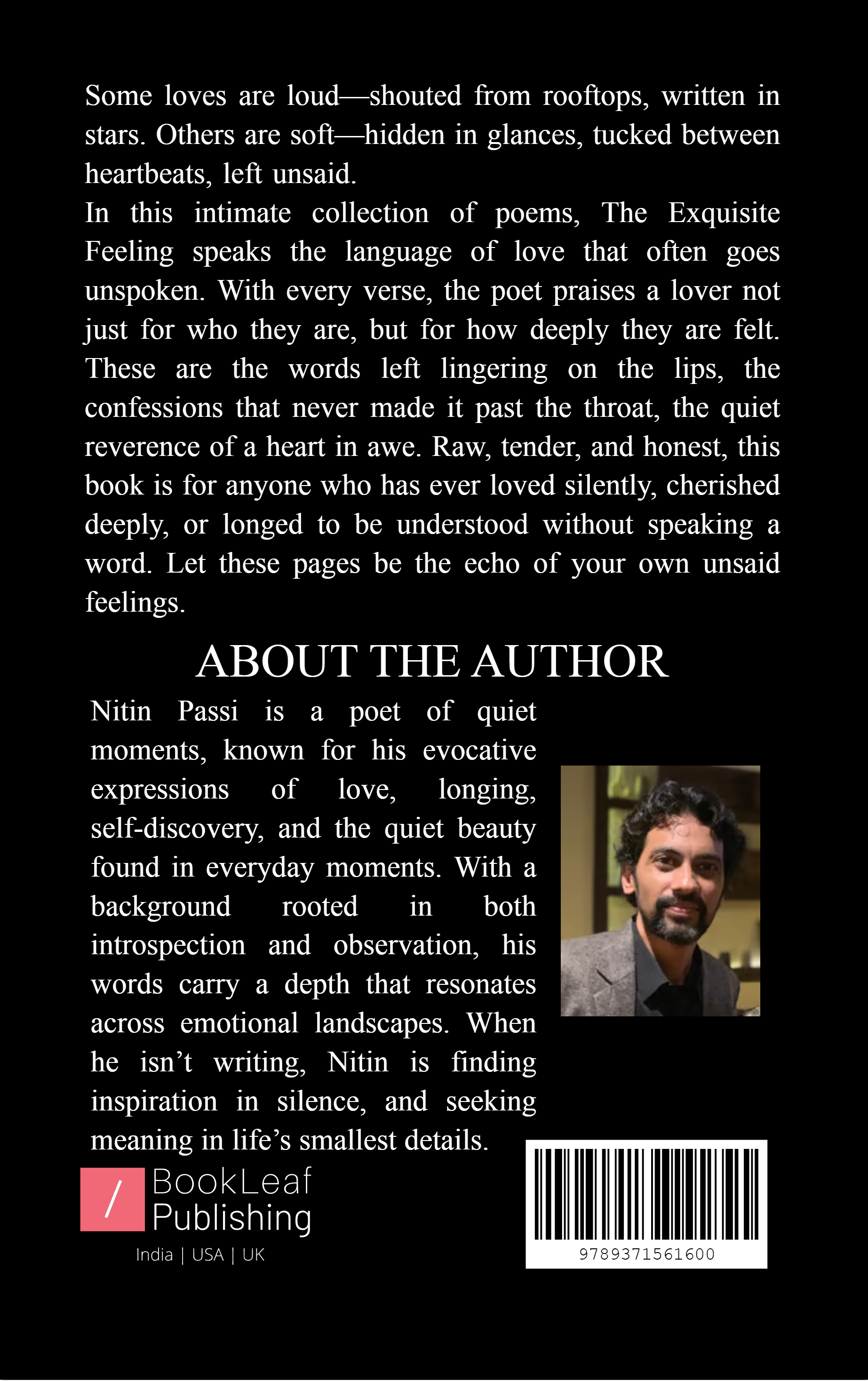 In this intimate collection of poems, The Exquisite Feeling speaks the language of love that often goes unspoken. With every verse, the poet praises a lover not just for who they are, but for how deeply they are felt. These are the words left lingering on the lips, the confessions that never made it past the throat, the quiet reverence of a heart in awe. Raw, tender, and honest, this book is for anyone who has ever loved silently, cherished deeply, or longed to be understood without speaking a word. Let these pages be the echo of your own unsaid feelings.