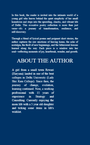 In this book, the reader is invited into the intimate world of a young girl who leaves behind the quiet simplicity of her small hometown and steps into the sprawling, chaotic, and vibrant life of Delhi. This evocative poetry collection is more than just verse—it's a journey of transformation, resilience, and self-discovery.