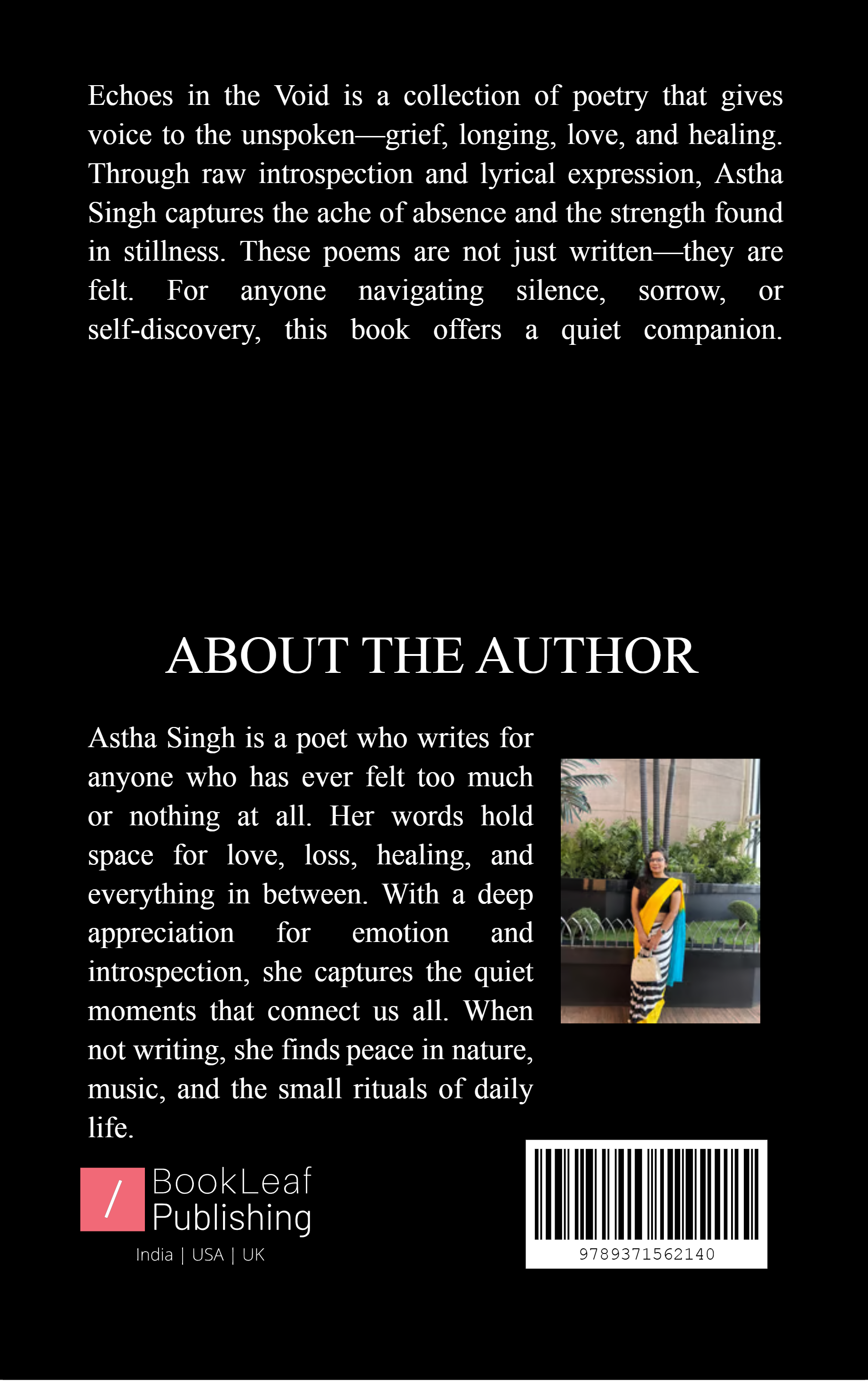 Echoes in the Void is a collection of poetry that gives voice to the unspoken—grief, longing, love, and healing. Through raw introspection and lyrical expression, Astha Singh captures the ache of absence and the strength found in stillness. These poems are not just written—they are felt. For anyone navigating silence, sorrow, or self-discovery, this book offers a quiet companion.