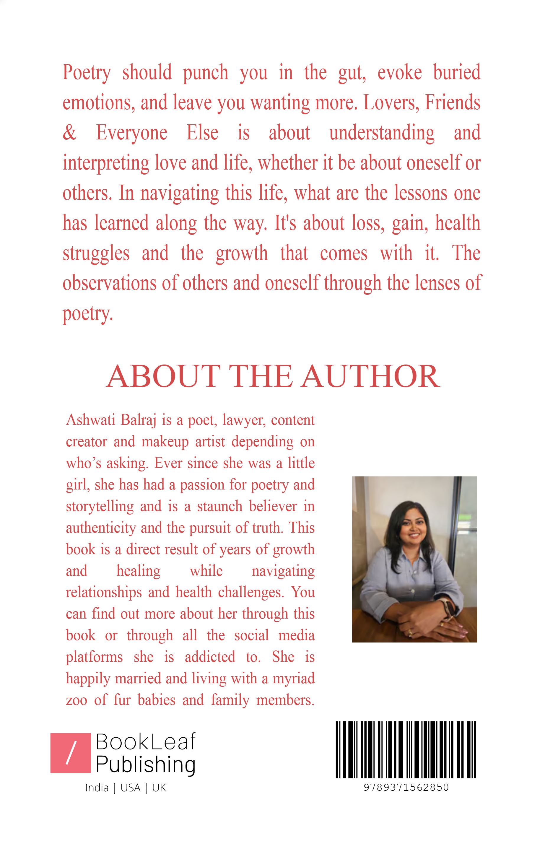 Poetry should punch you in the gut, evoke buried emotions, and leave you wanting more. Lovers, Friends & Everyone Else is about understanding and interpreting love and life, whether it be about oneself or others. In navigating this life, what are the lessons one has learned along the way. It's about loss, gain, health struggles and the growth that comes with it. The observations of others and oneself through the lenses of poetry.