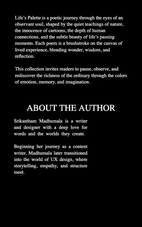 Life’s Palette is a collection of poems that captures the subtle hues of everyday life, drawn from moments of observation, memory, and emotion. Through reflections inspired by nature, people, childhood cartoons, and life’s small yet significant instances, Srikantham Madhumala paints a vivid landscape of thought and feeling.