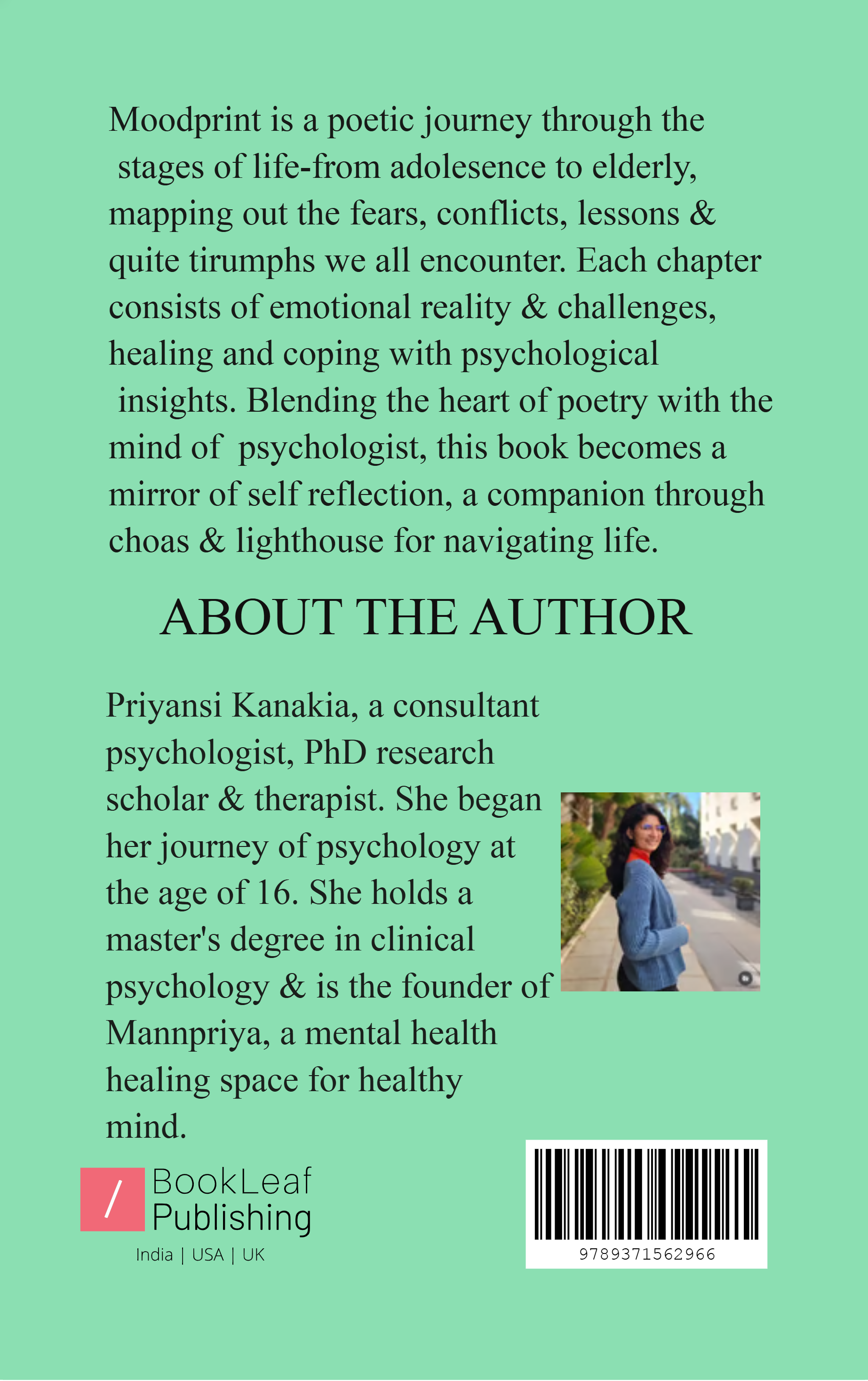 Moodprint is a poetic journey through the stages of life — from adolescence to elderhood — mapping out the fears, conflicts, lessons, and quiet triumphs we all encounter. Each chapter contains three poems: the first explores emotional reality, the second offers healing and coping, and the third brings in psychological insights and therapeutic wisdom. Blending the heart of poetry with the mind of a psychologist, this book becomes a mirror for reflection, a companion through chaos, and a lighthouse for those navigating life’s inner tides. Whether you're growing up, growing old, or growing through, Moodprint reminds you: it’s okay to seek help — and healing is a story worth reading.