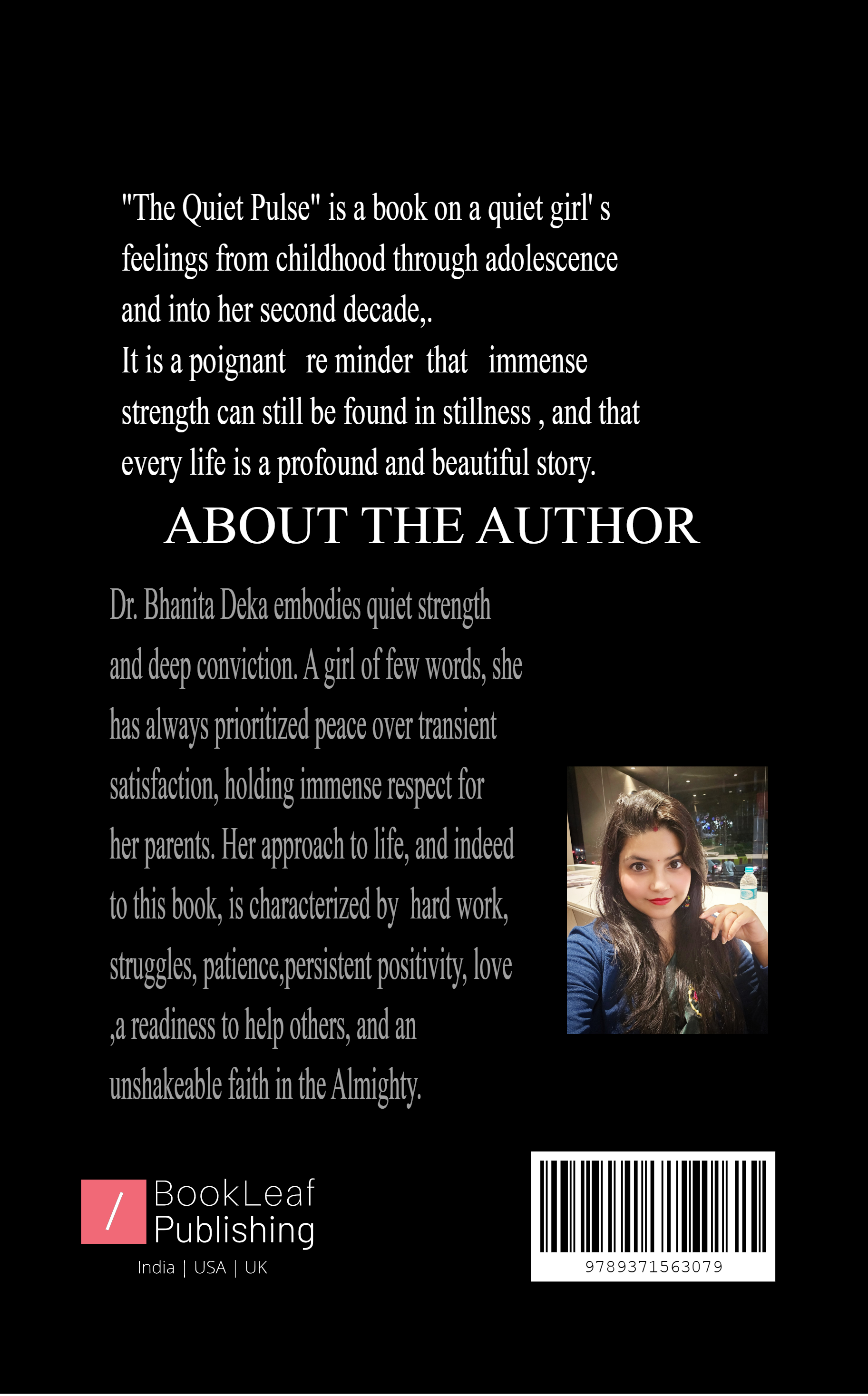 From the innocence of childhood dreams to the demanding corridors of an MBBS life, "A Quiet Pulse" is a lyrical journey through the formative years of a young woman destined to heal. This evocative poetry collection unwraps the tender layers of a childhood filled with academic triumphs and the quiet awe for a respected father, tempered by the gentle fear of a loving mother. Discover the secret whispers of adolescent crushes, the silent battles of life's struggles, and the profound transformation within the rigorous world of medicine. This book is a testament to the dreams pursued, the challenges overcomed, and the compassionate heart beating at the core of a quiet life.