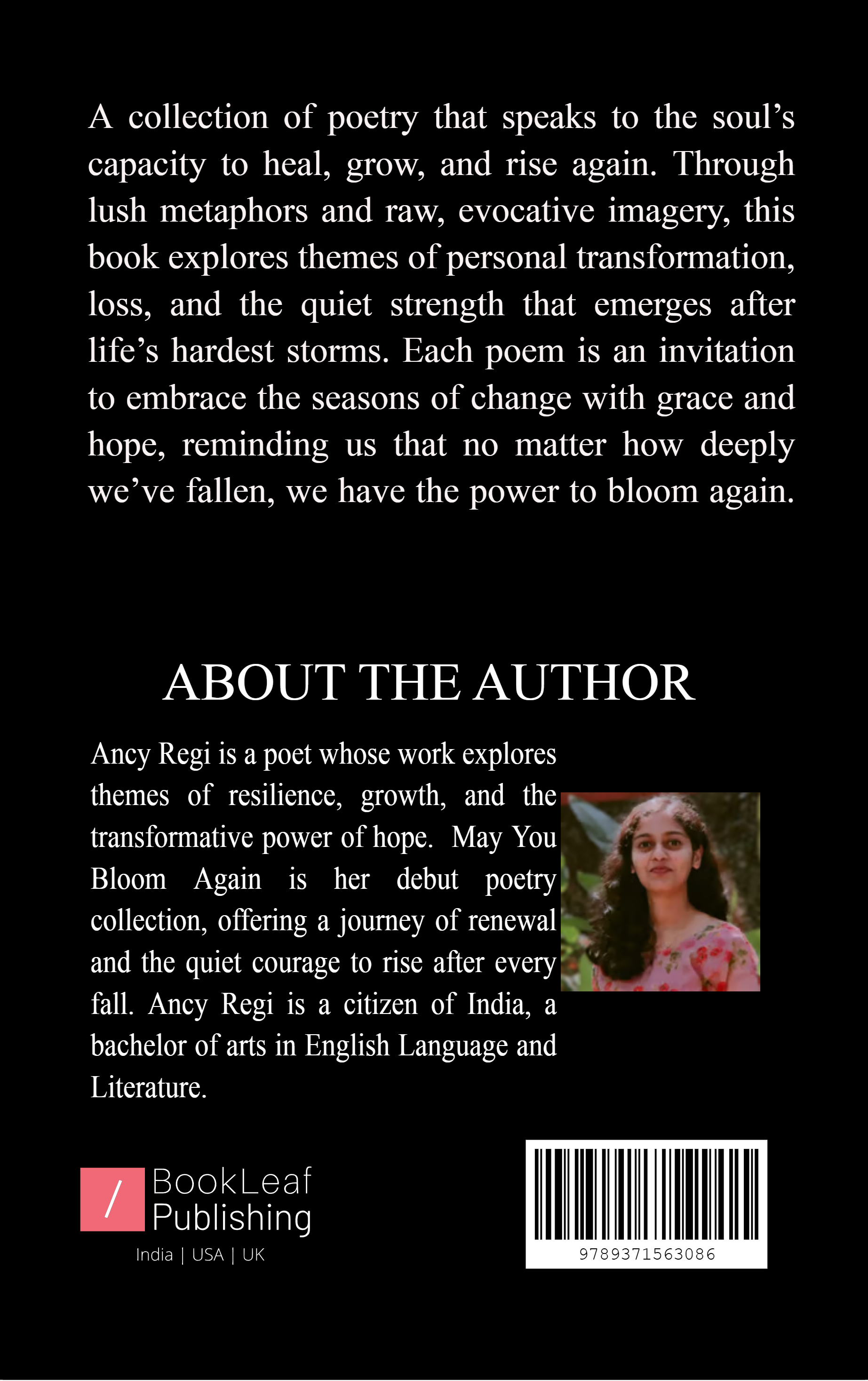 "May you Bloom Again" is a collection of short poems that speaks to the soul’s capacity to heal, grow, and rise again. Through lush metaphors and raw, evocative imagery, this book explores themes of personal transformation, loss, and the quiet strength that emerges after life’s hardest storms. Each poem is an invitation to embrace the seasons of change with grace and hope, reminding us that no matter how deeply we’ve fallen, we have the power to bloom again.