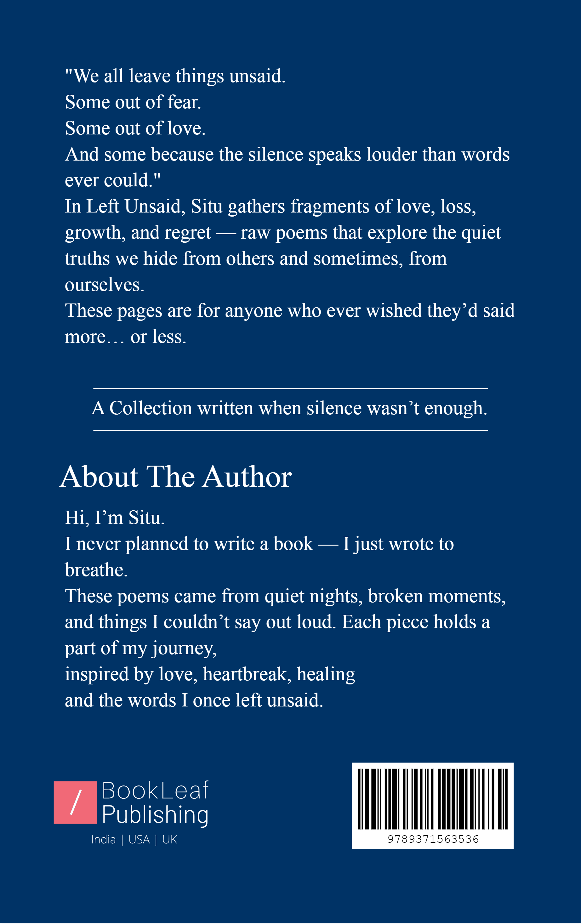 Left Unsaid is a collection of poems written in moments when silence wasn’t enough. It explores love, loss, heartbreak, healing, and the emotions we struggle to put into words. Each poem carries a quiet truth — some born in joy, some in pain, and some in the spaces in between.