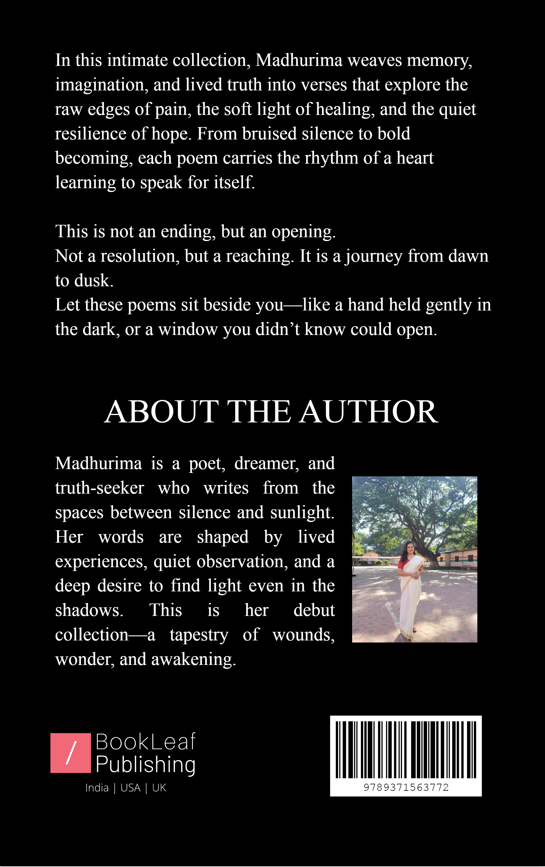 This debut poetry collection by Madhurima is a journey through memory, loss, healing, and rediscovery. With a voice both tender and unflinching, she writes of emotional wounds, silent struggles, and the quiet strength it takes to survive and grow. Each poem holds space for vulnerability, resilience, and hope—transforming pain into poetry and silence into song. Rooted in lived experiences and moments of imagined truth, the collection offers a hand to those navigating their own in-betweens. This is not just a book of poems—it’s a testament to becoming, to breaking free, and to letting the light in.