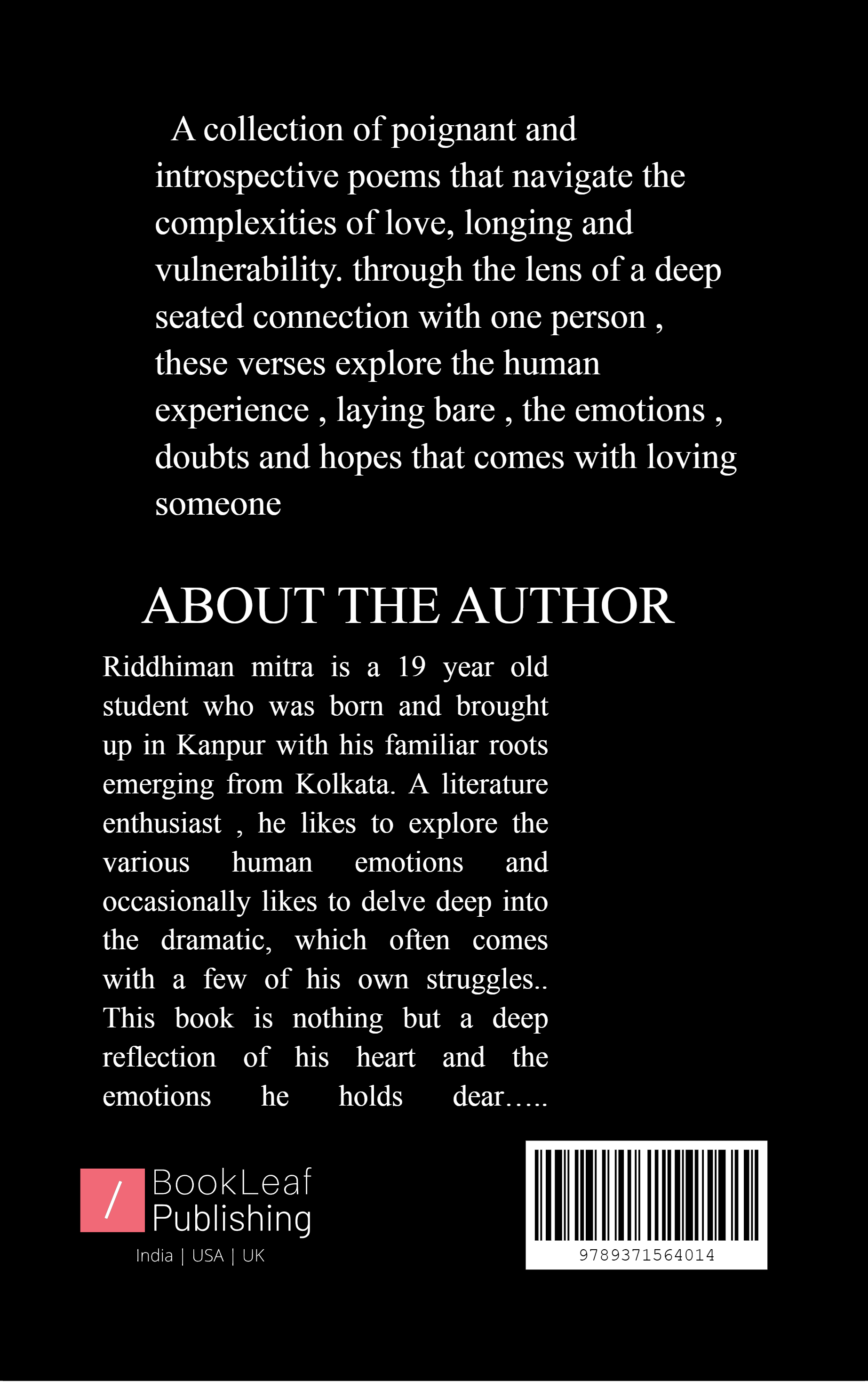 A collection of poignant and introspective poems that navigate the complexities of love , longing and vulnerability. Through the lens of a deep seated connection with one person , these verses explore the human experience , laying bare the emotions , and hopes that comes with loving someone....