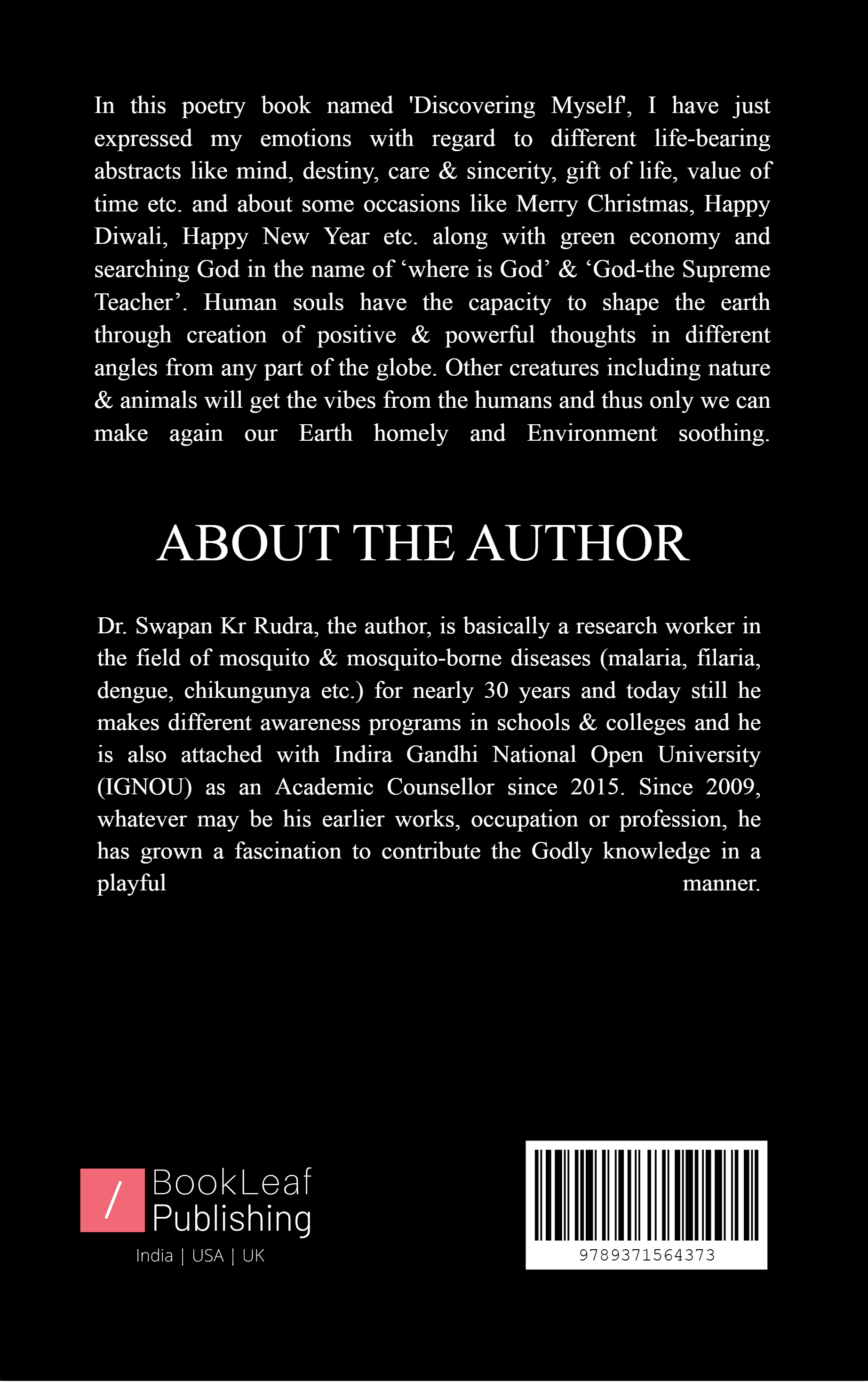 In this poetry book named 'Discovering Myself', I have just expressed my emotions with regard to different life-bearing abstracts like mind, destiny, care & sincerity, gift of life, value of time etc. and about some occasions like Merry Christmas, Happy Diwali, Happy New Year etc. along with green economy and searching God in the name of ‘where is God’ & ‘God-the Supreme Teacher’. Human souls have the capacity to shape the earth through creation of positive & powerful thoughts in different angles from any part of the globe. Other creatures including nature & animals will get the vibes from the humans and thus only we can make again our Earth homely and Environment soothing.