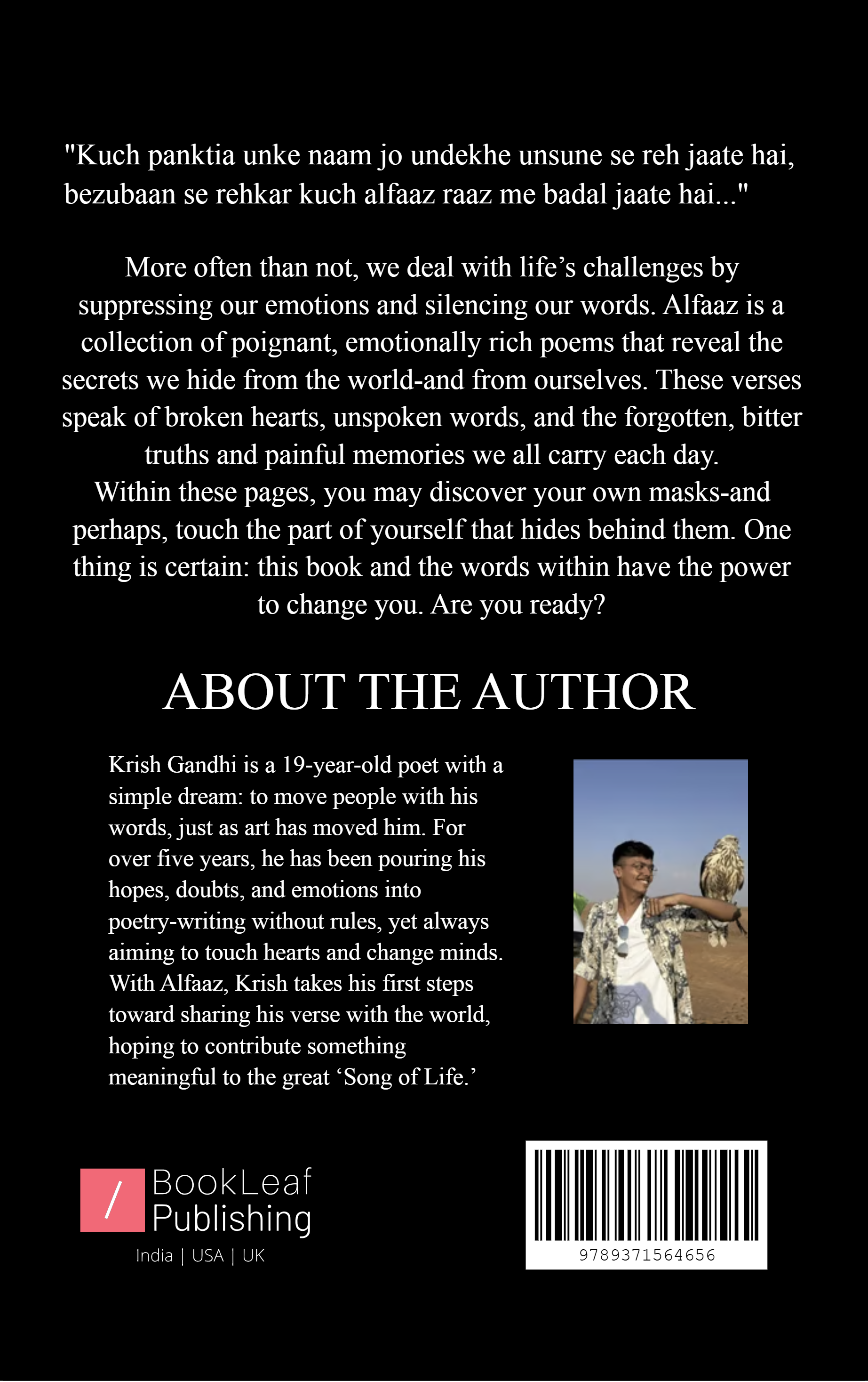 More often than not, we deal with life’s challenges by suppressing our emotions and silencing our words. Alfaaz is a collection of poignant, emotionally rich poems that reveal the secrets we hide from the world-and from ourselves. These verses speak of broken hearts, unspoken words, and the forgotten, bitter memories we all carry each day.