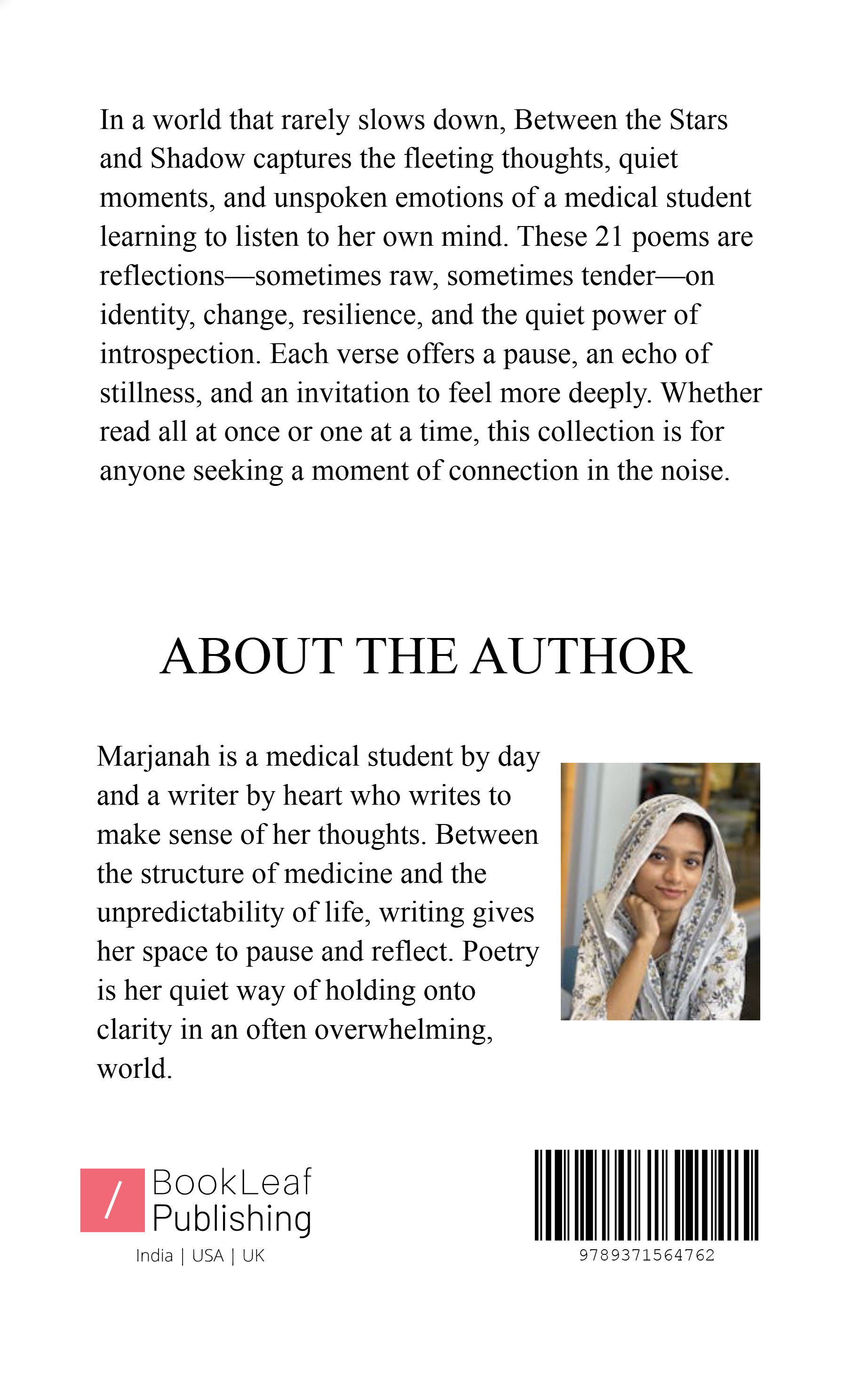 Between the Stars and Shadow is a tender collection of poems that explore the delicate space between light and darkness, hope and loss. Through vivid imagery and heartfelt emotion, the poems invite readers into moments of quiet reflection, vulnerability, and resilience. Each poem captures the complexity of love, memory, and the search for meaning in a fast-moving world. This book offers a gentle refuge for those who find themselves caught between dreams and reality, holding onto clarity amid uncertainty.