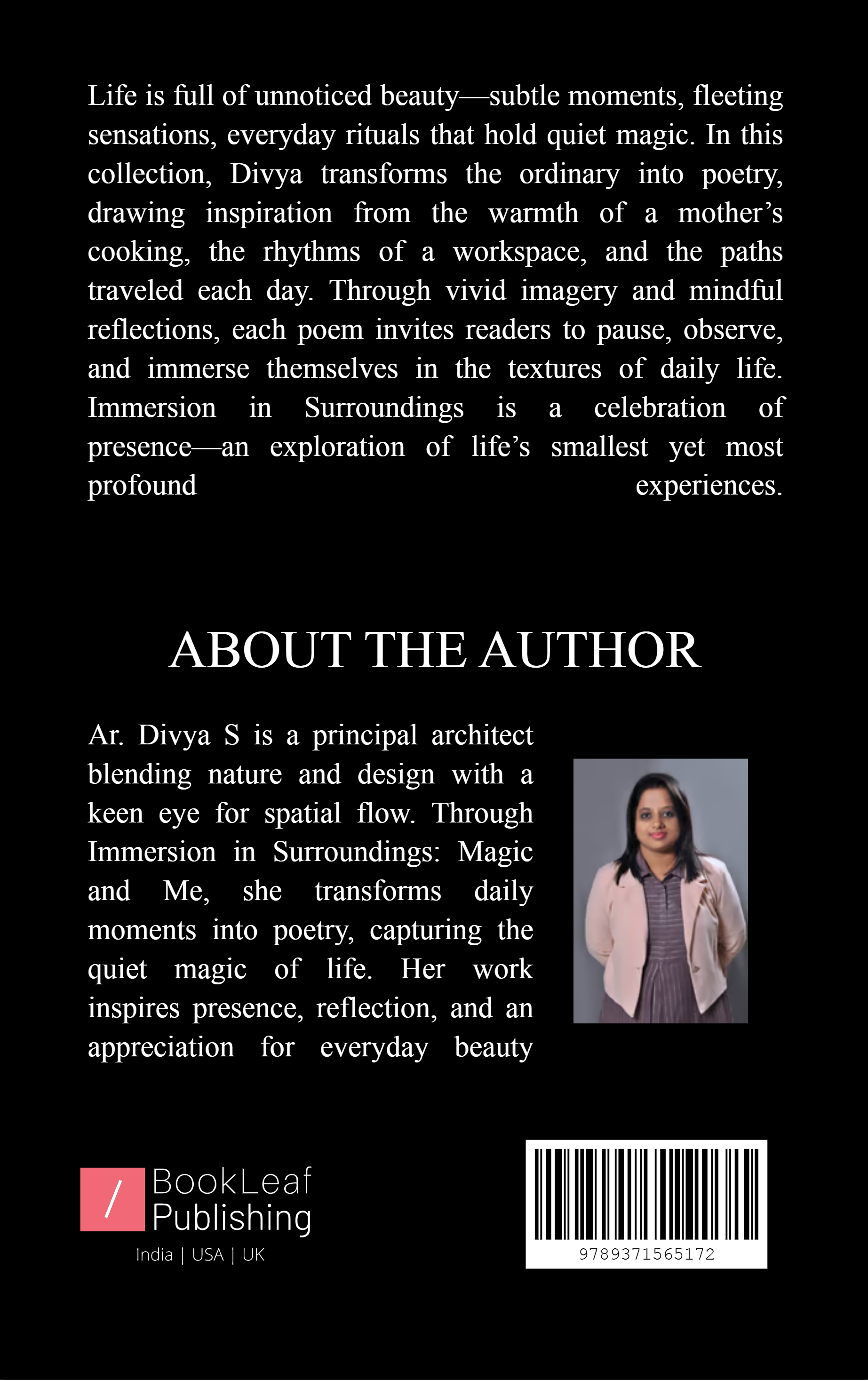 Life is full of unnoticed beauty—subtle moments, fleeting sensations, everyday rituals that hold quiet magic. In this collection, Divya transforms the ordinary into poetry, drawing inspiration from the warmth of a mother’s cooking, the rhythms of a workspace, and the paths traveled each day. Through vivid imagery and mindful reflections, each poem invites readers to pause, observe, and immerse themselves in the textures of daily life. Immersion in Surroundings is a celebration of presence—an exploration of life’s smallest yet most profound experiences.