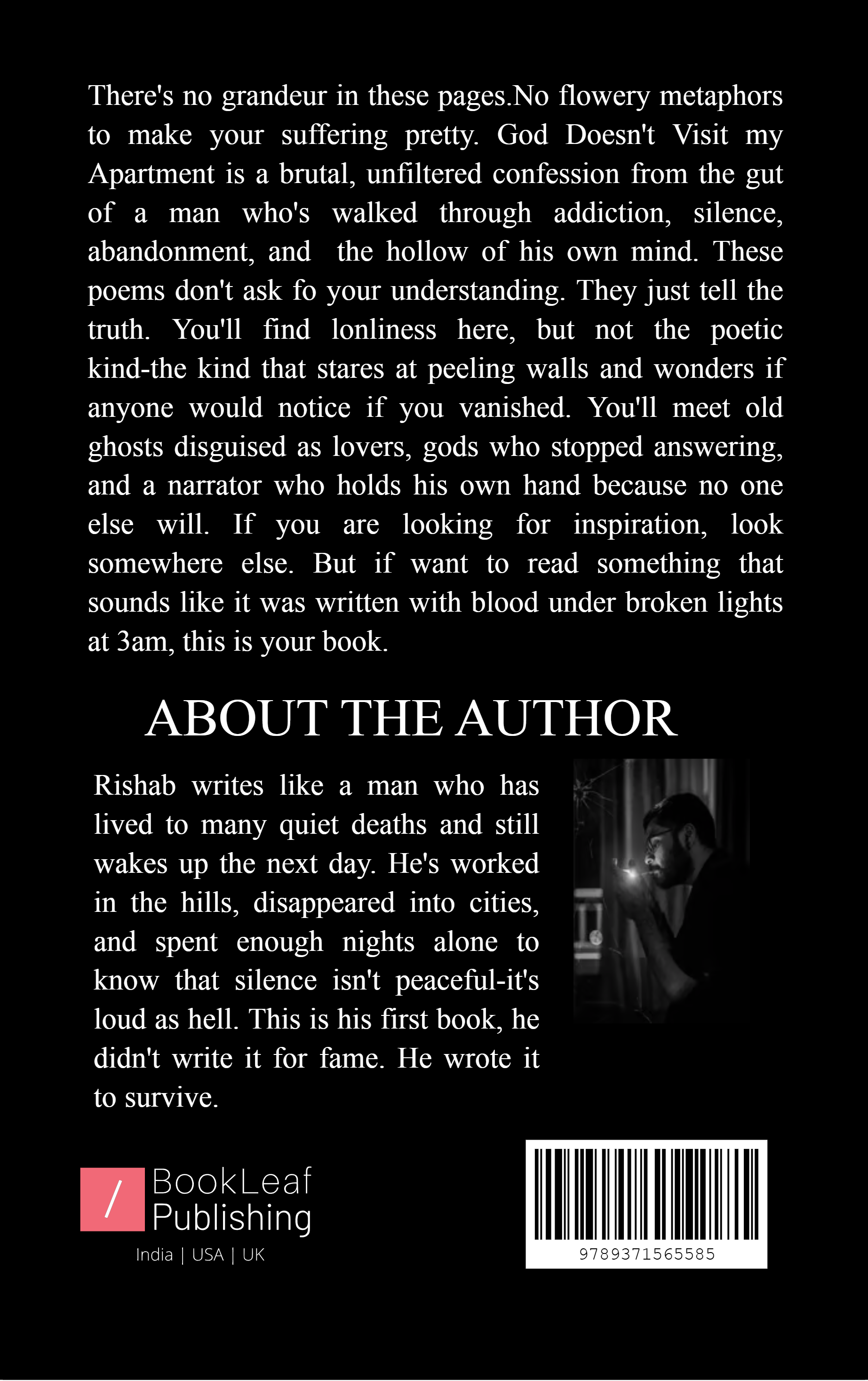 There's no grandeur in these pages.No flowery metaphors to make your suffering pretty. God Doesn't Visit my Apartment is a brutal, unfiltered confession from the gut of a man who's walked through addiction, silence, abandonment, and  the hollow of his own mind. These poems don't ask fo your understanding. They just tell the truth. You'll find lonliness here, but not the poetic kind-the kind that stares at peeling walls and wonders if anyone would notice if you vanished. You'll meet old ghosts disguised as lovers, gods who stopped answering, and a narrator who holds his own hand because no one else will. If you are looking for inspiration, look somewhere else.