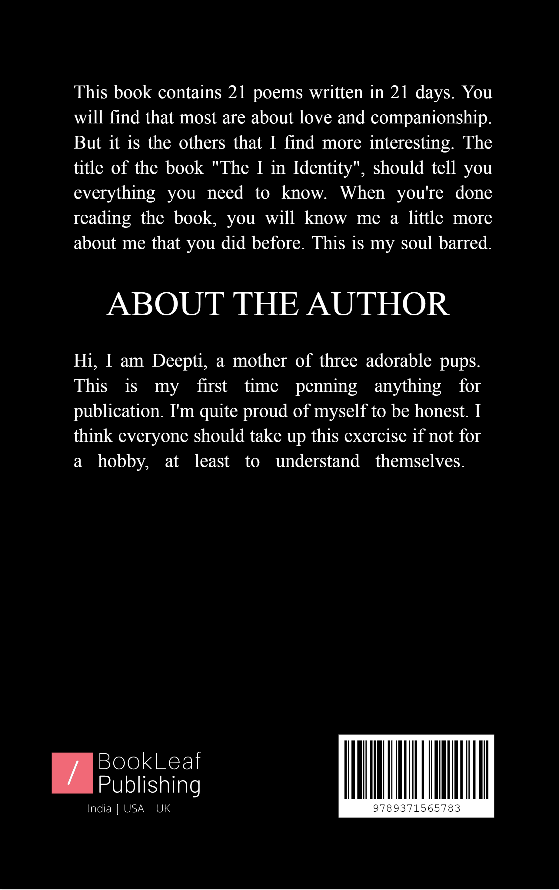 This book contains 21 poems written in 21 days. You will find that most are about love and companionship. But it is the others that I find more interesting. The title of the book "The I in Identity", should tell you everything you need to know. When you're done reading the book, you will know me a little more about me that you did before. This is my soul barred.