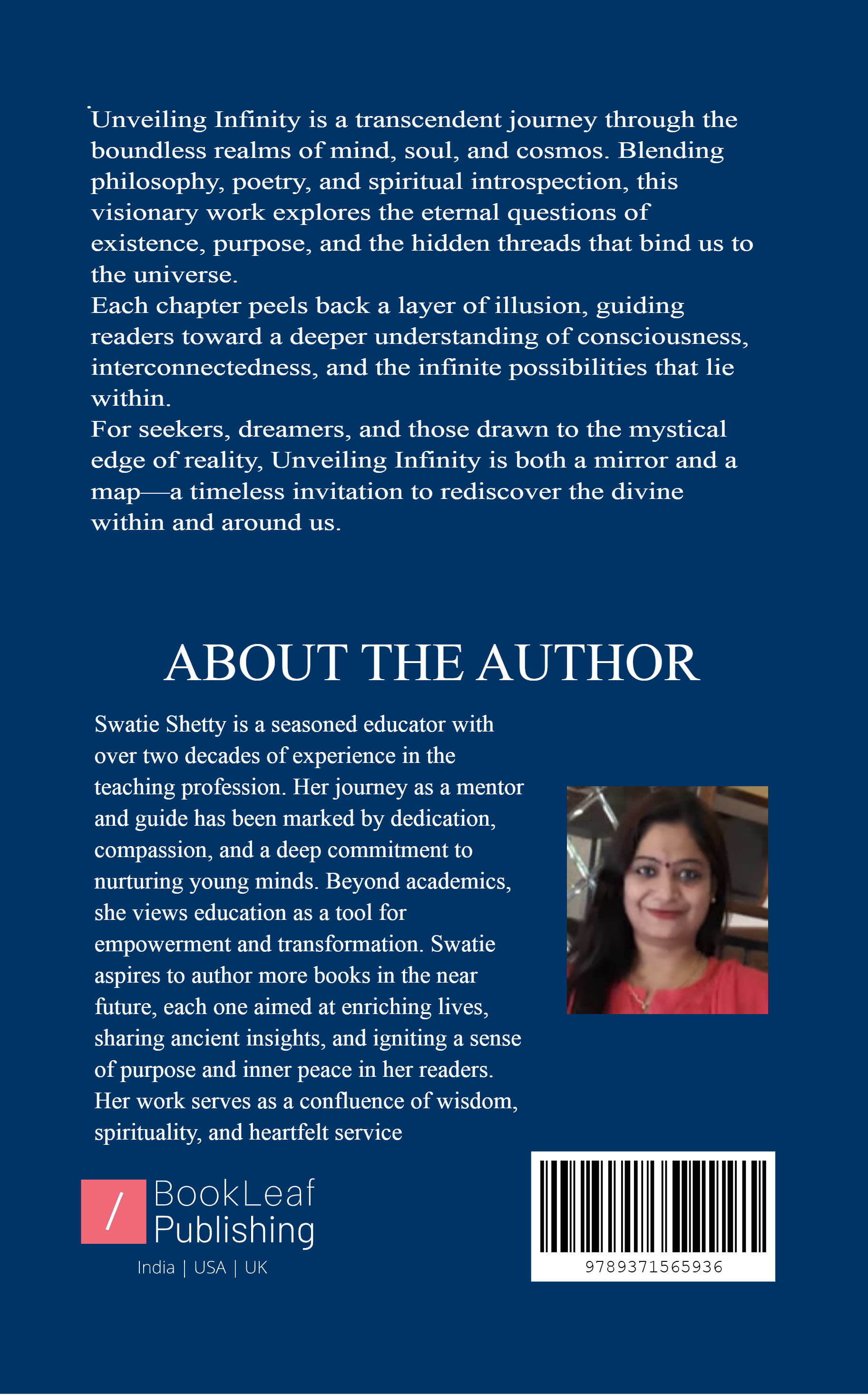 Unveiling Infinity is a gentle journey into life's biggest questions-Who are we? Why are we here? What lies beyond what we can see? Through thoughtful reflections and simple truths, this book invites readers to look within and around, to see the deeper meaning in everyday moments. It speaks to the quiet wonder we all feel at times, and to the inner knowing that there is more to life than meets the eye, Unveiling Infinity is not about finding all the answers, but about opening the heart to the mystery that connects us all.