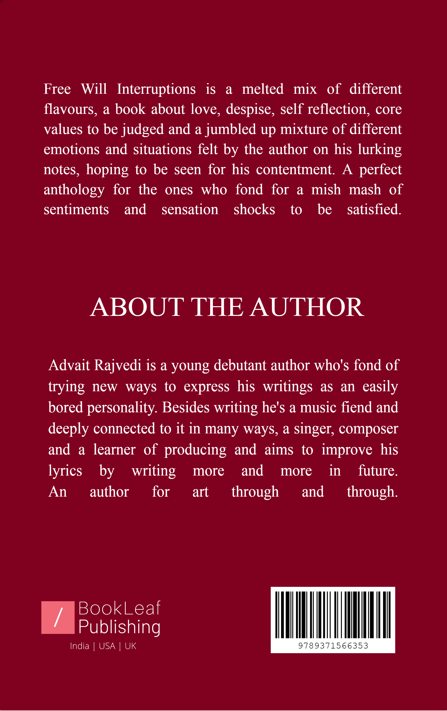 Free Will Interruptions is a melted mix of different flavours, a book about love, despise, self reflection, core values to be judged and a jumbled up mixture of different emotions and situations felt by the author on his lurking notes, hoping to be seen for his contentment. A perfect anthology for the ones who fond for a mish mash of sentiments and sensation shocks to be satisfied.