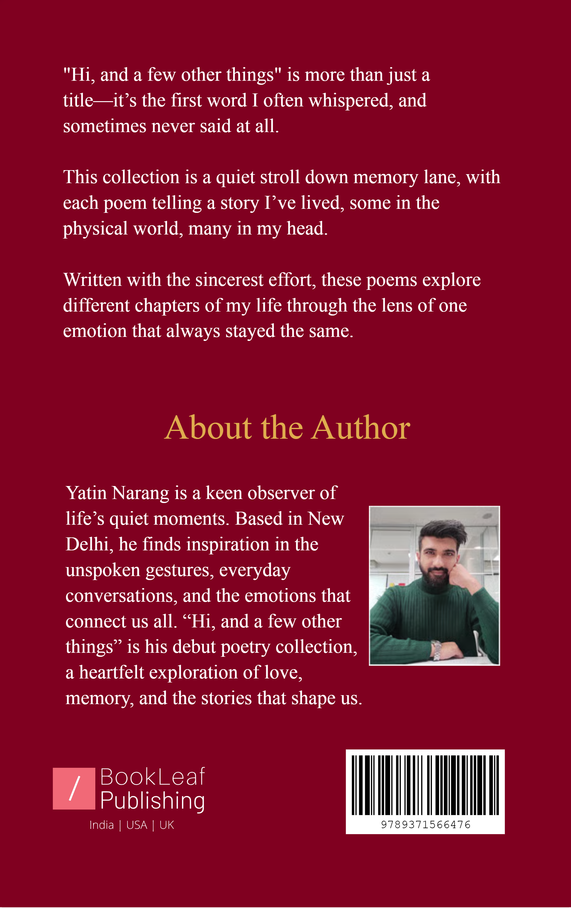 "Hi, and a few other things" is Yatin Narang’s debut poetry collection, a heartfelt journey through love, memories, and the small moments that shape our lives. Each verse invites you into a world where emotions bloom in everyday conversations.