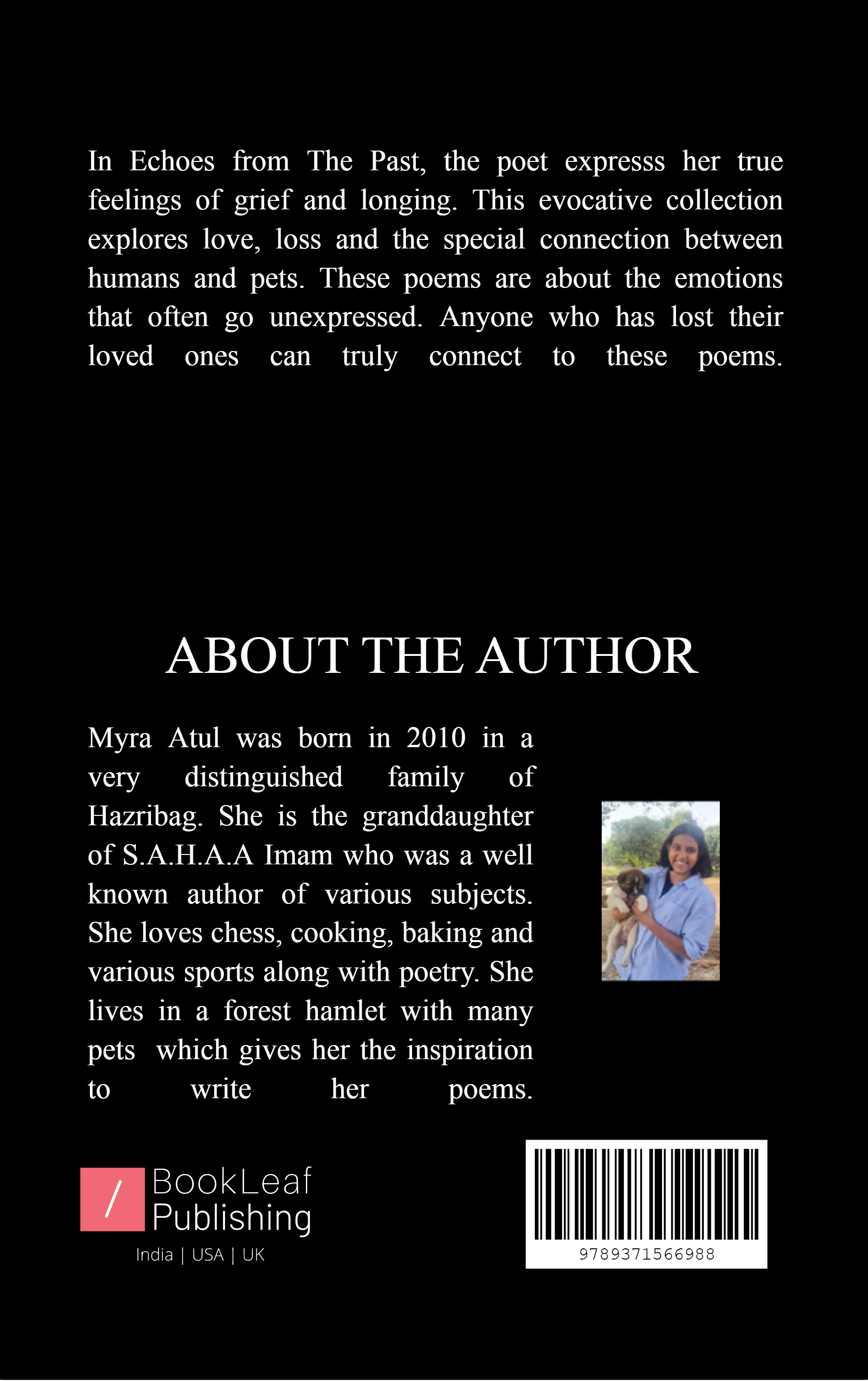 'Echoes from The Past' is a collection of poems which express the author's feelings of love, loss and healing. They reflect the special bond between humans and their beloved pets, and the emptiness their absence leaves behind. These poems are written in remembrance of moments close to the heart. They are for anyone who has lost someone they loved deeply. But this book is not only about loss- it's about love so strong it lives on, long after saying final goodbyes. Let these poems remind you that love never dies.