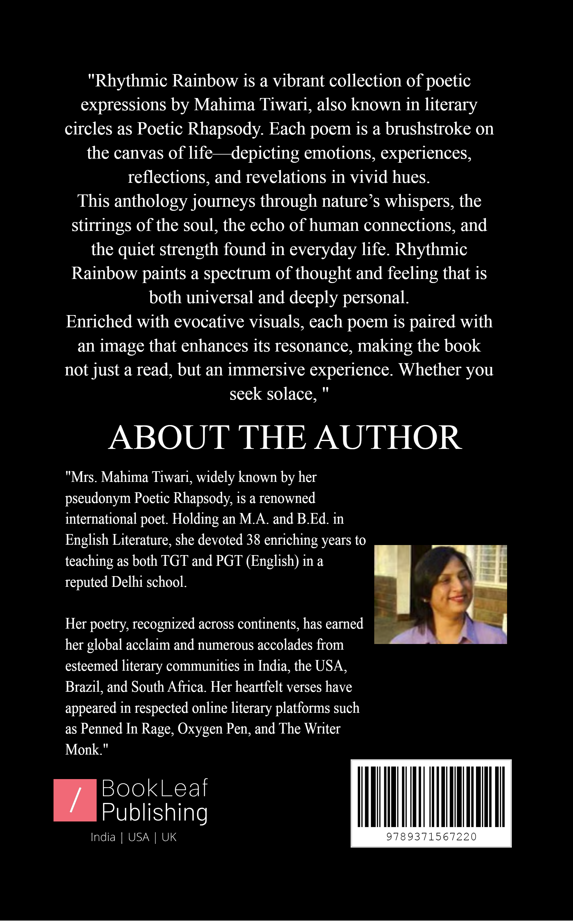 Rhythmic Rainbow is a vibrant collection of poetic expressions by Mahima Tiwari, also known in literary circles as Poetic Rhapsody. Each poem is a brushstroke on the canvas of life—depicting emotions, experiences, reflections, and revelations in vivid hues.