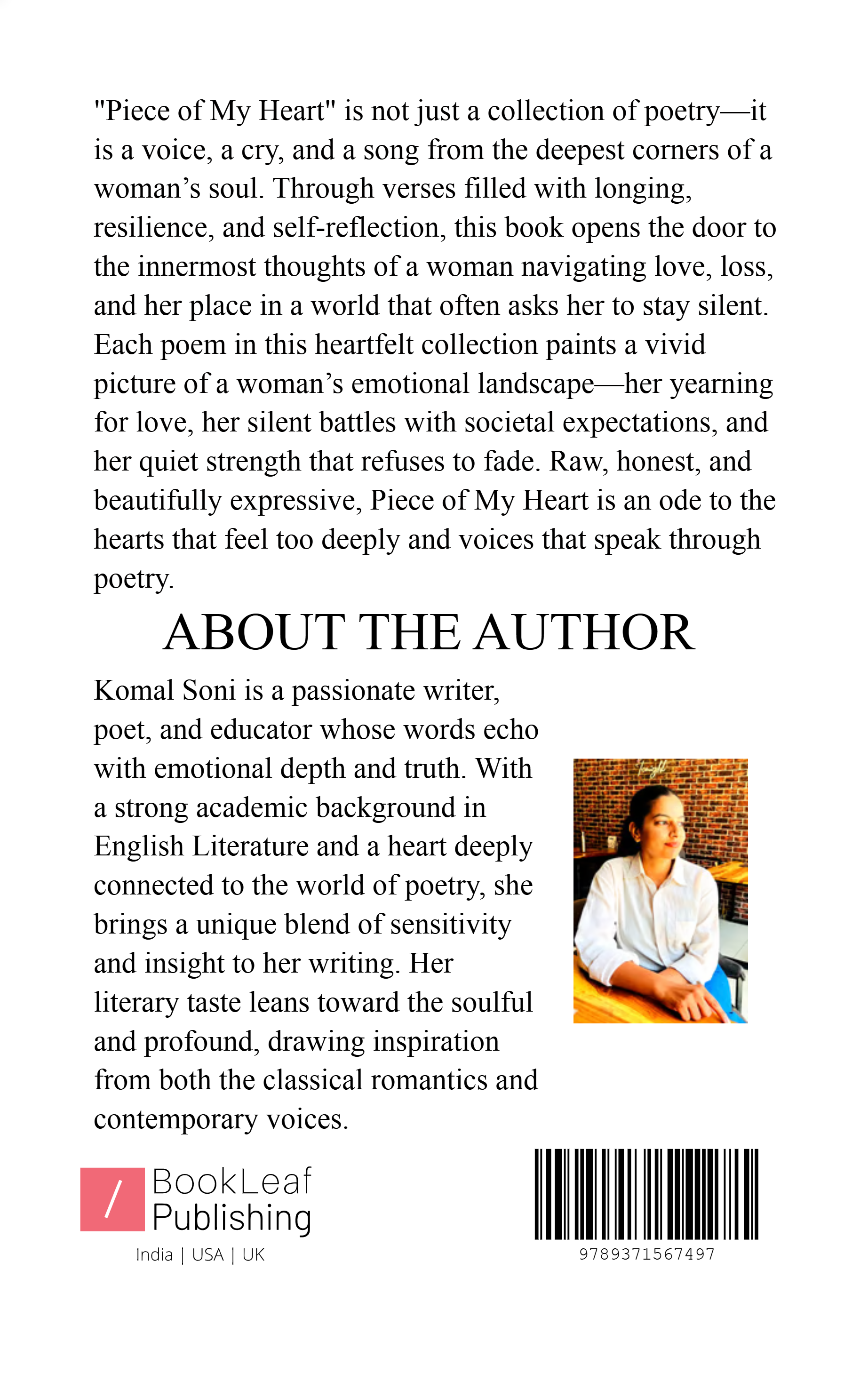 In Piece of My Heart, the author presents an evocative tapestry of poems woven with the delicate threads of love, identity, and the struggle of a woman’s spirit within a conformist society. The book explores themes of emotional vulnerability, the desire to be seen and heard, and the conflict between a woman’s dreams and the expectations imposed upon her. Each poem stands as a mirror to the emotional tides within a woman's heart—overflowing with hope, rebellion, and beauty. The poem touches the inner life of a woman, her intimate thoughts, her quiet appeals, and her unbreakable resilience. More than poetry, this book is a journey into the emotional life of every woman who has dared to love.