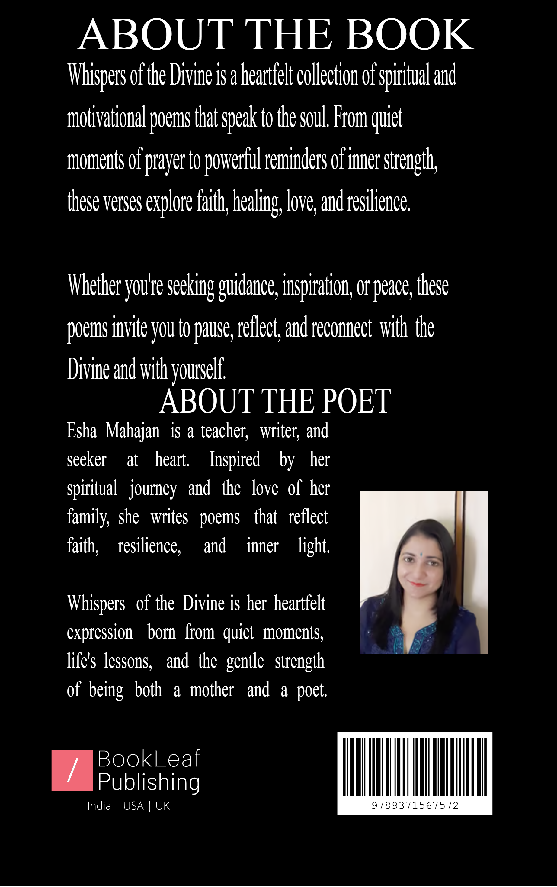 Whispers of the Divine is a soulful collection of poems that blend spirituality, emotion, and motivation. Each verse is a quiet conversation with the universe a reflection of faith, an embrace of hope, and a celebration of inner strength. Rooted in cultural essence and written with heartfelt simplicity, these poems guide the reader toward self-discovery, peace, and a deeper connection with the divine. Whether you're seeking comfort, inspiration, or a moment of reflection, this book will speak gently to your heart.