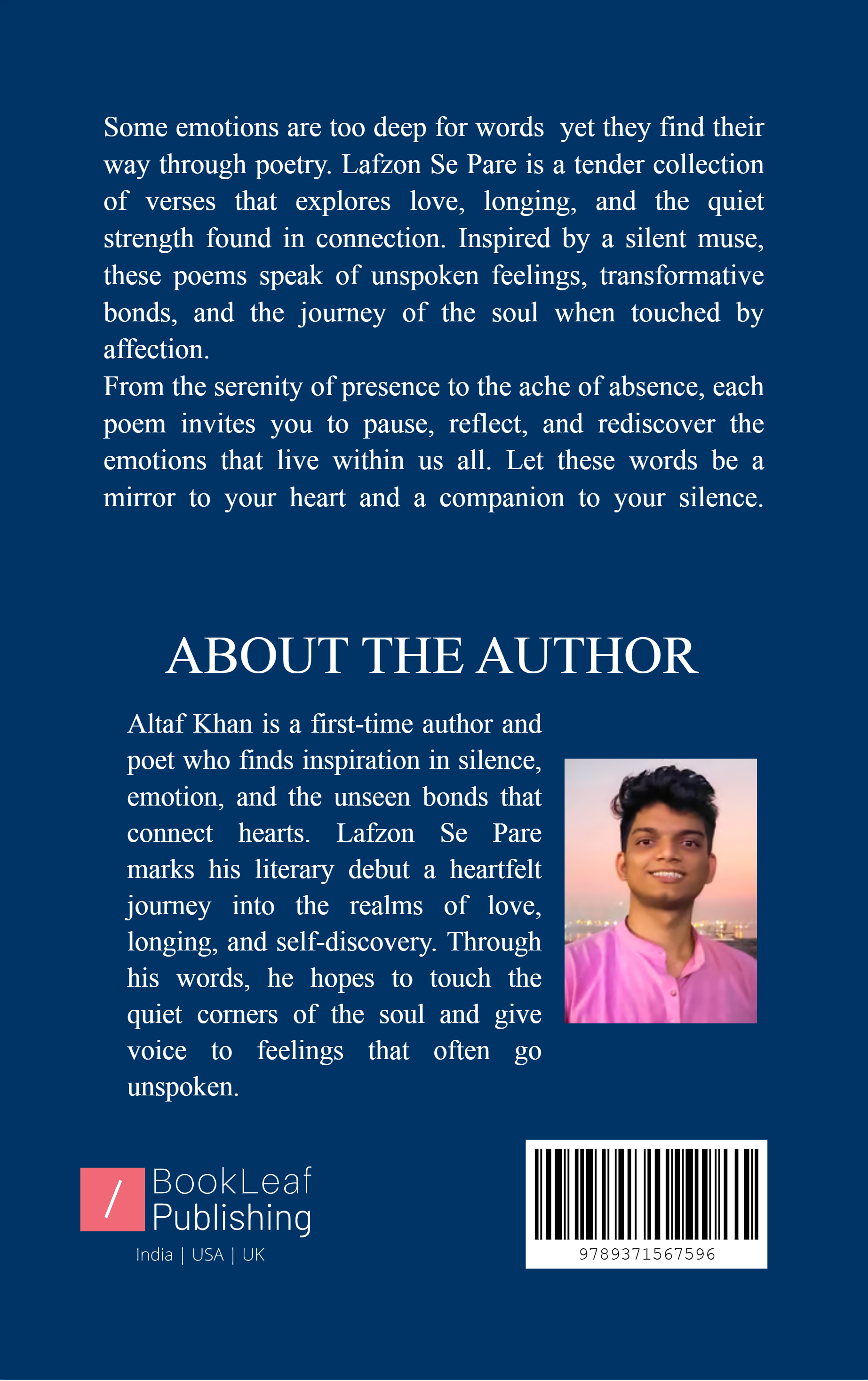 Lafzon Se Pare: Poems from the Silence Within is a soulful collection of poetry exploring the quiet depth of love, longing, and emotional connection. In his debut book, Altaf Khan captures fleeting moments and unspoken feelings, turning them into verses that echo with vulnerability and hope. Inspired by a silent muse, these poems invite readers to reflect, relate, and find comfort in shared emotions. Perfect for anyone who has loved, lost, or simply felt deeply, this book offers a tender space where words fall short and poetry begins.