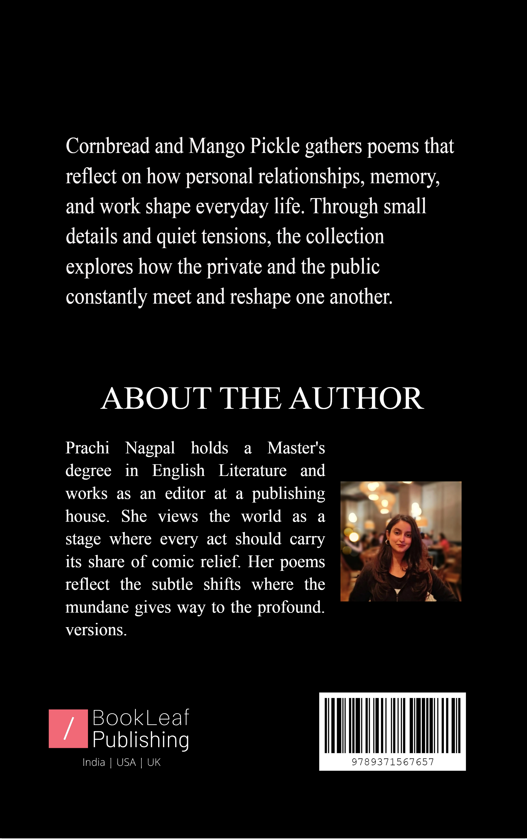 Cornbread and Mango Pickle gathers poems that reflect on how personal relationships, memory, and work shape everyday life. Through small details and quiet tensions, the collection explores how the private and the public constantly meet and reshape one another.