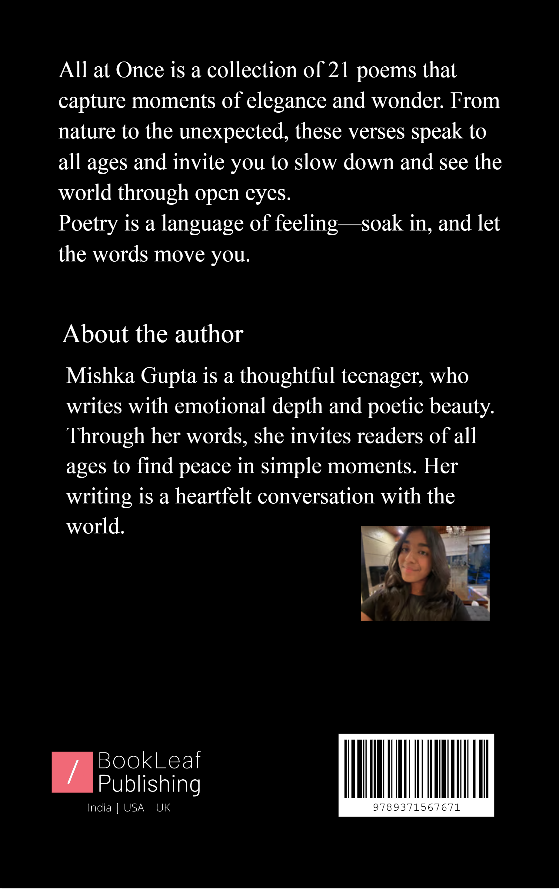 This book is a captivating anthology of poems, each showcasing its own distinct charm. The verses delve into themes such as nature, human experiences, journeys, and beyond. The title “All at Once” encapsulates the diverse and profound themes intricately interwoven throughout the collection.