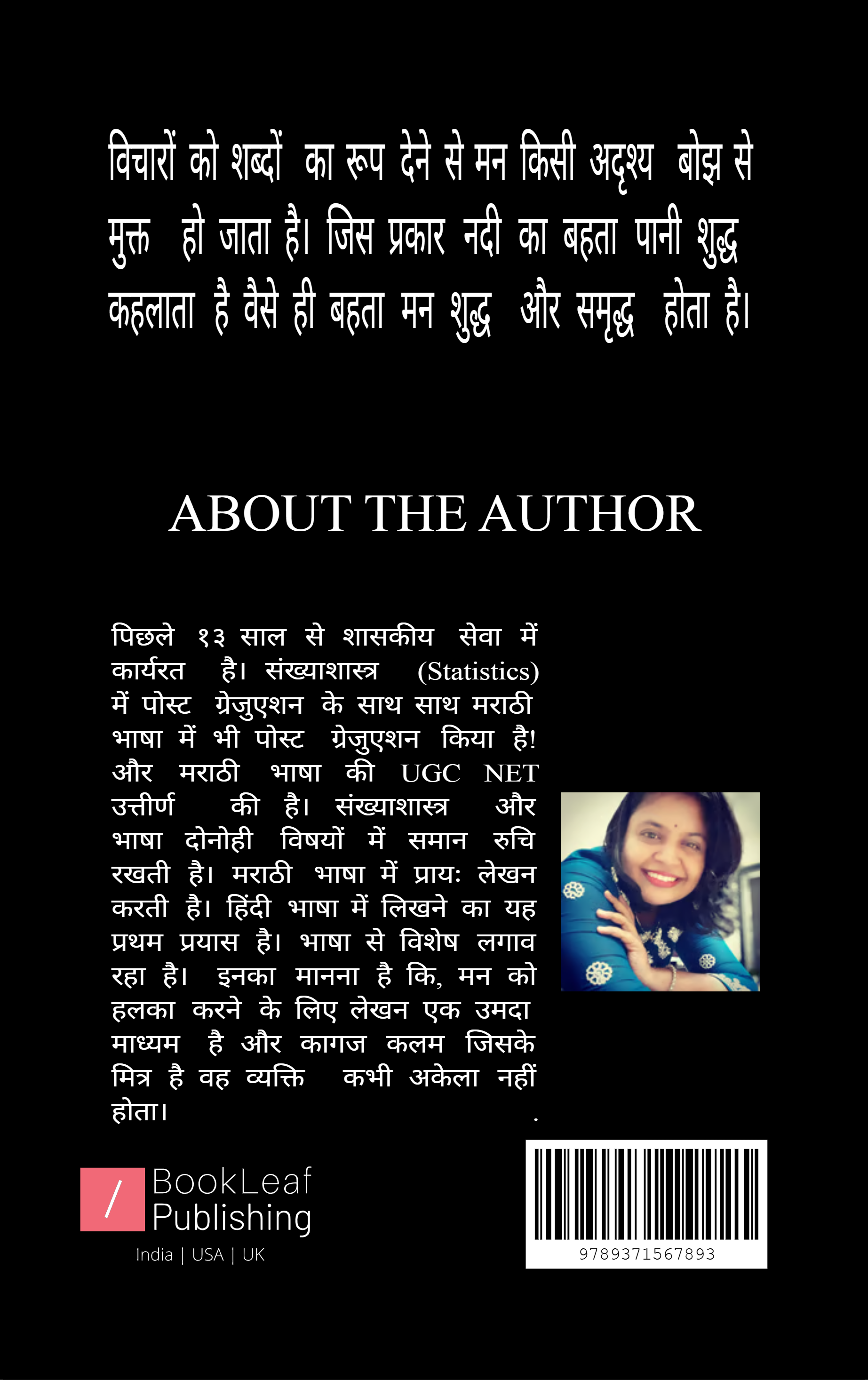 मेरे विचारों को शब्दों का रूप देने का मैने प्रयास किया है। मैं आशा करती हूं, कि आप मेरी कविताएं आपके जीवन में आए अनुभवों से जुड़े हुए पाएंगे।विचारों को शब्दों का रूप देने से मन किसी अदृश्य बोझ से मुक्त हो जाता है। जिस प्रकार नदी का बहता पानी शुद्ध कहलाता है वैसे ही बहता मन शुद्ध और समृद्ध होता है।
