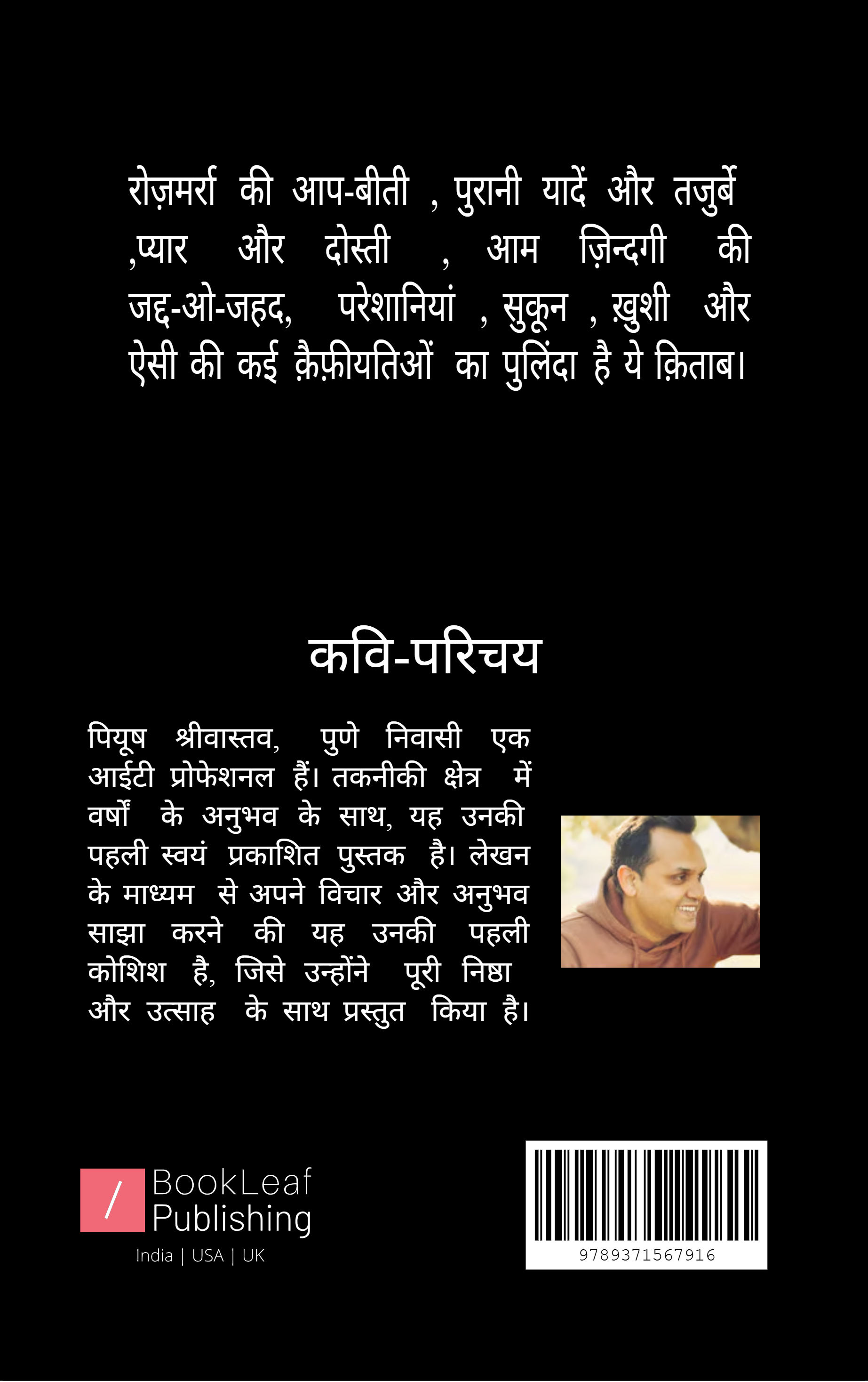 The book is a compilation of 21 selected poems in Hindustani, covering various themes depicting the phases through which life goes, relationships and random experiences.