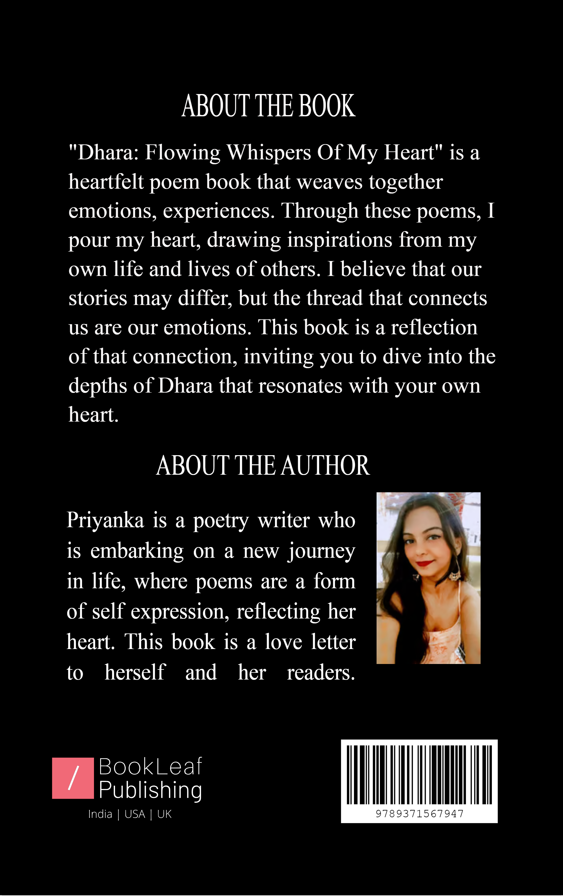 "Dharaa: Whispers of My Heart" is a heartfelt poem book that explores emotions, perceptions, and experiences. Inspired by personal stories, these poems reflect our shared emotional connections. This beginner-friendly collection invites you to dive into the depths of Dhara, a flow of emotions that resonates with your own heart. Let the words guide you through life's ebbs and flows, and discover the beauty of shared human experience. A touching and thought-provoking read that will connect with your heart and mind.