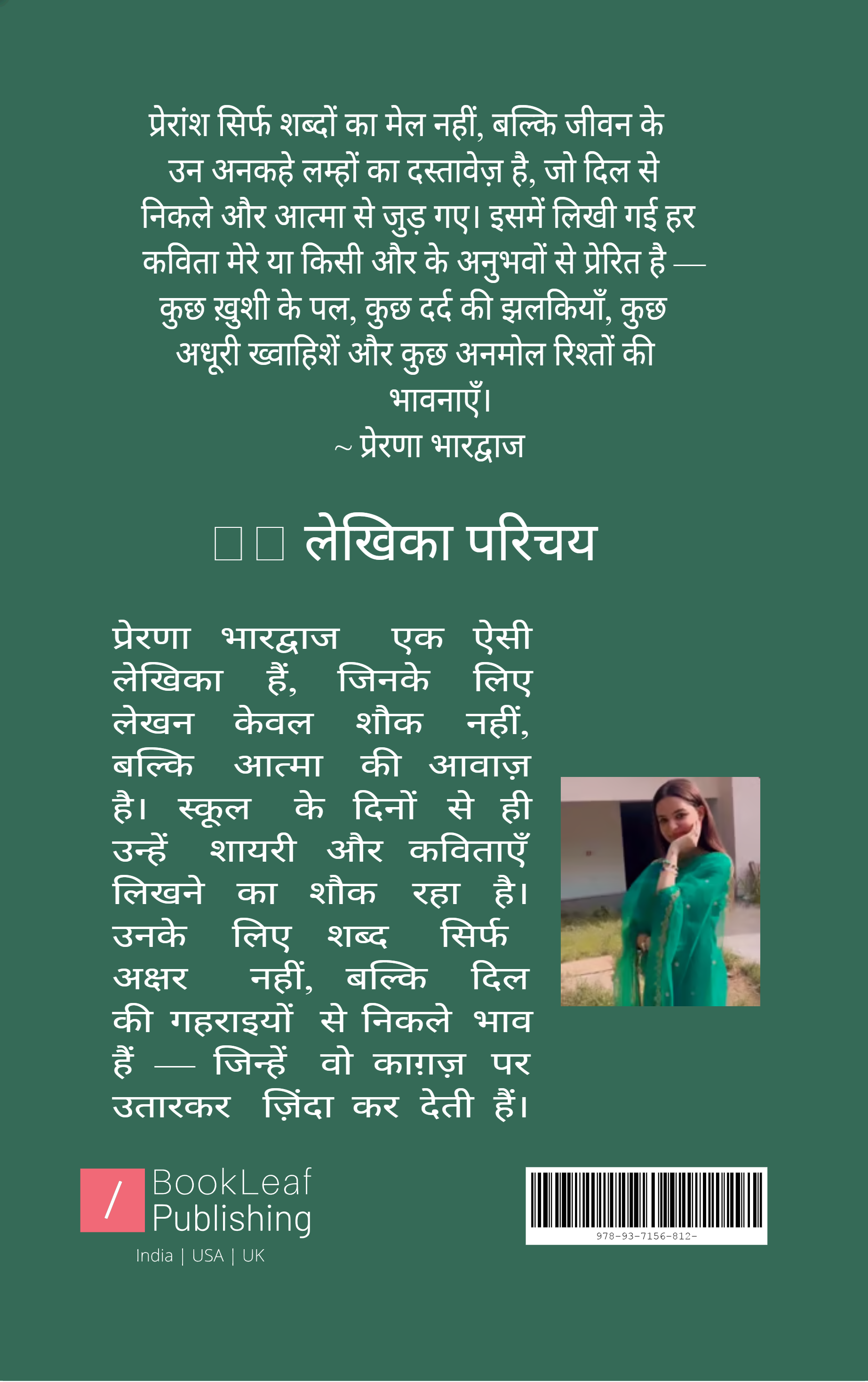 प्रेरांश सिर्फ शब्दों का मेल नहीं, बल्कि जीवन के उन अनकहे लम्हों का दस्तावेज़ है, जो दिल से निकले और आत्मा से जुड़ गए। इसमें लिखी गई हर कविता मेरे या किसी और के अनुभवों से प्रेरित है — कुछ ख़ुशी के पल, कुछ दर्द की झलकियाँ, कुछ अधूरी ख्वाहिशें और कुछ अनमोल रिश्तों की भावनाएँ।