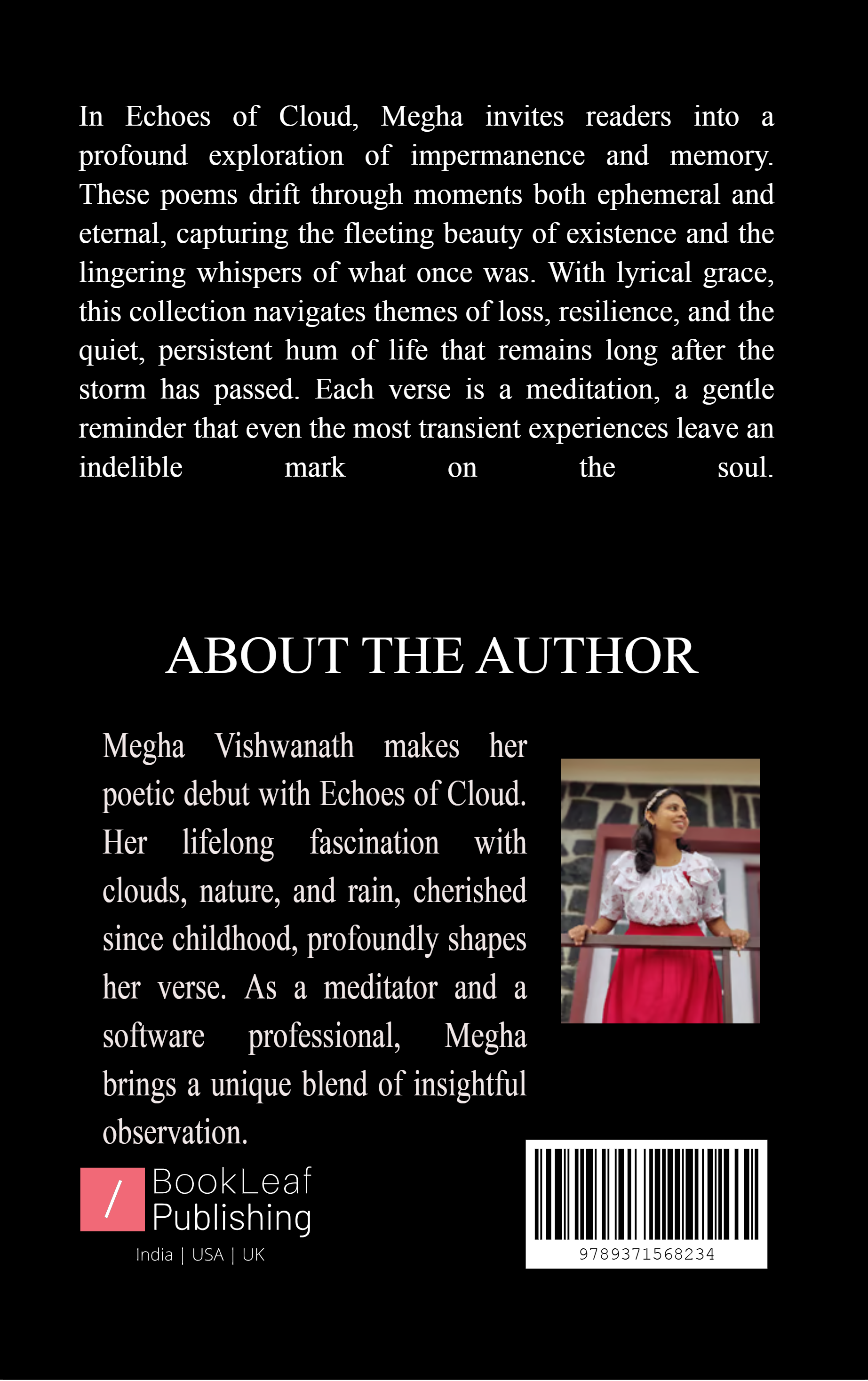 Discover the profound resonance of fleeting moments in Echoes of Cloud, the evocative debut collection from poet Megha Vishwanath. With a voice shaped by a lifelong connection to clouds, nature, and rain, Megha explores the intricate tapestry of memory and the quiet strength found within impermanence. These poems drift through landscapes of reflection and observation, transforming the ordinary into the extraordinary and finding deep meaning in what lingers long after it has passed. A testament to the power of contemplative insight, Echoes of Cloud is a luminous journey into the self, inviting readers to embrace the beauty of transition and the echoes that define us.