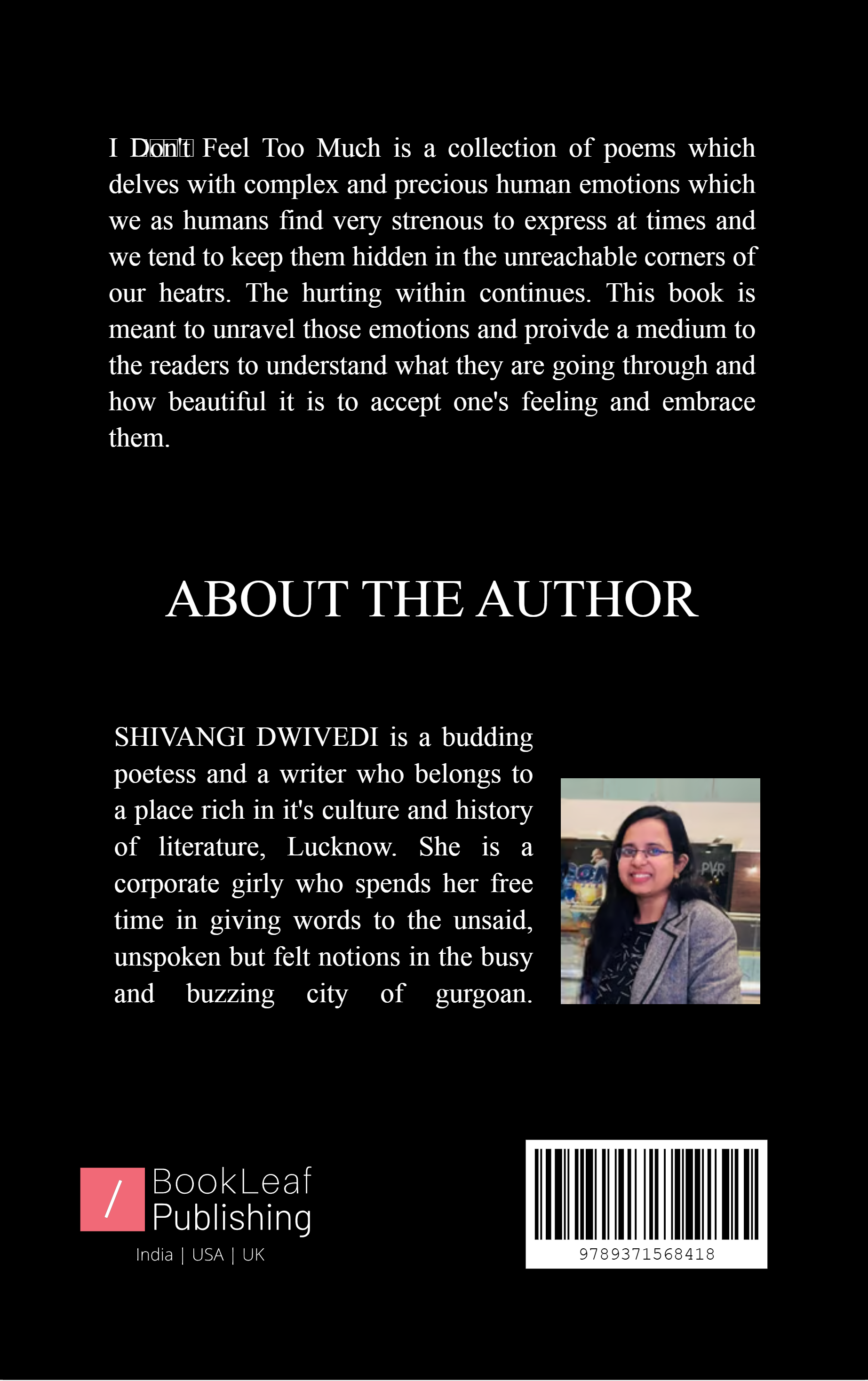 The Book "I D̶o̶n̶'t̶ Feel Too Much" is a book for those who feel too much but don't speak of their feelings to anyone and keep them hidden in the corner of their heart till eternity. This book is for them and belongs to them to read what they couldn't express. It is for them to understand how beautiful it is to accept and go all out expressing each and every emotion... as these emotions are meant to be lived.