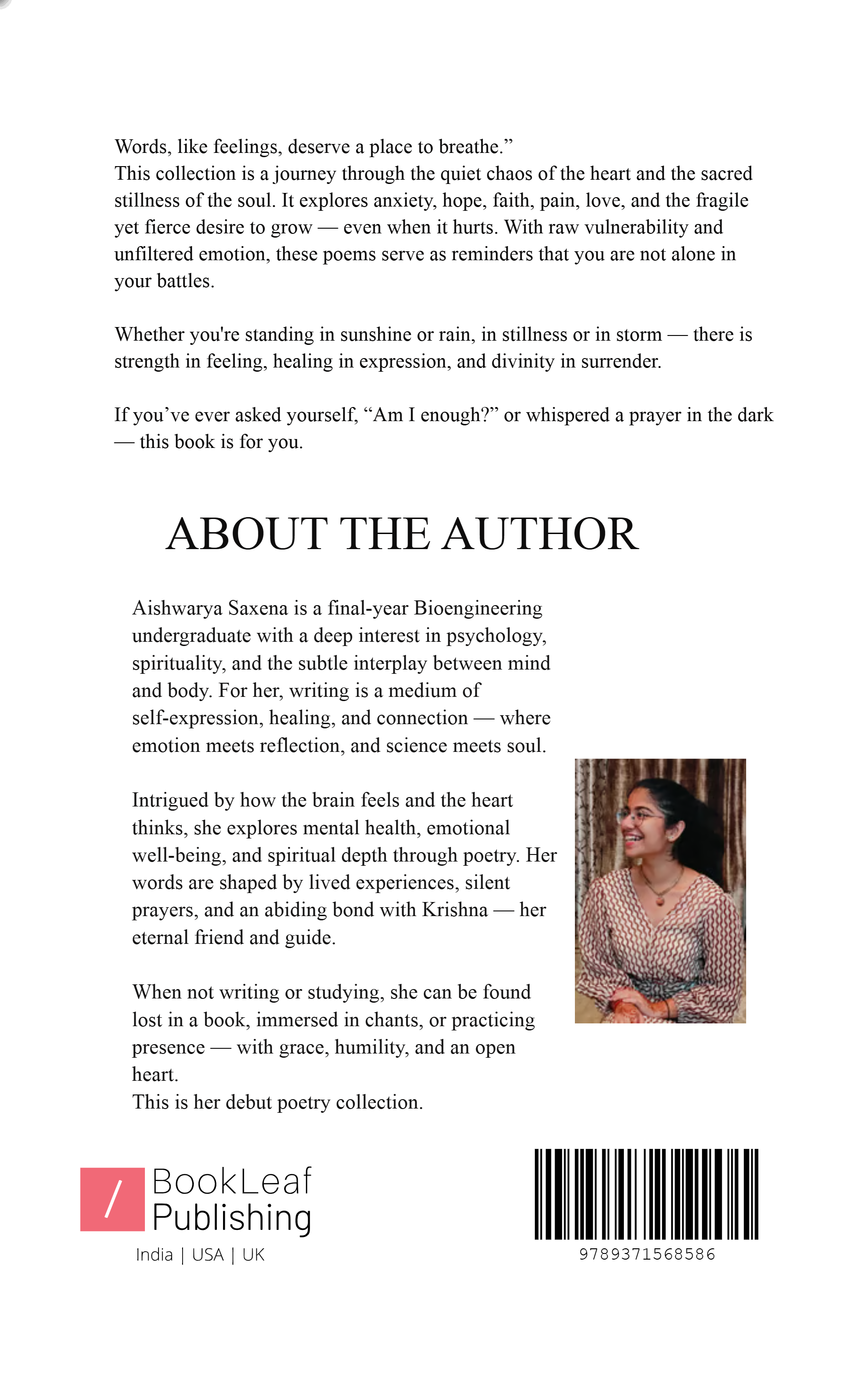 This collection is a journey through the quiet chaos of the heart and the sacred stillness of the soul. It explores anxiety, hope, faith, pain, love, and the fragile yet fierce desire to grow — even when it hurts. With raw vulnerability and unfiltered emotion, these poems serve as reminders that you are not alone in your battles.