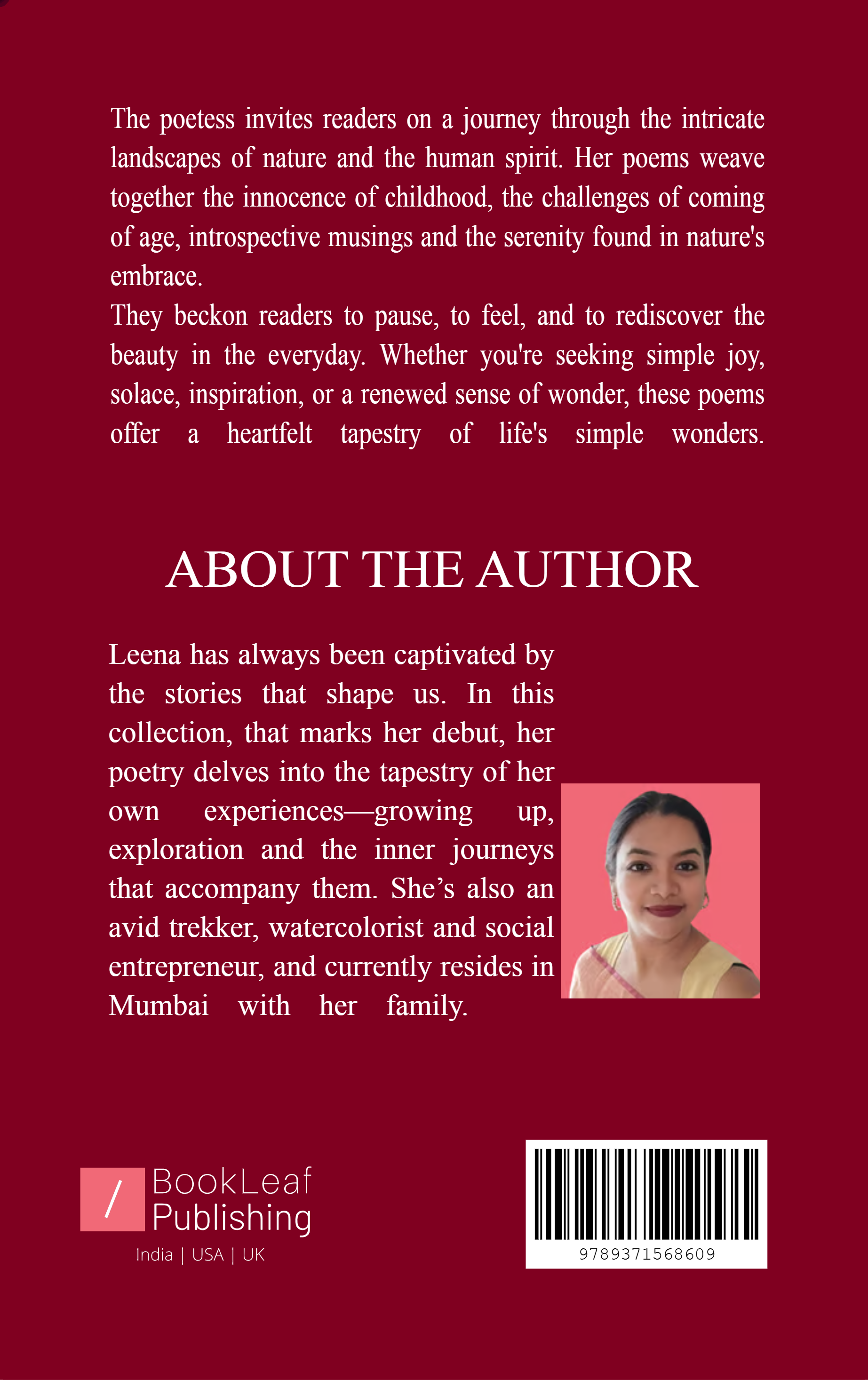 This heartfelt collection of poems offers a glimpse into the author’s relationships—with herself, with others, and with the world around her. Drawing inspiration from childhood memories, the journey of coming of age, and the serenity found in nature's embrace, her verses offer a heartfelt reflection on personal growth and discovery. Woven through each verse is the joy, wonder and growth she finds through her relationships and travels. Through vivid imagery and introspective verses, the collection celebrates the enriching experiences that shape our lives and the profound beauty discovered in nature's embrace.